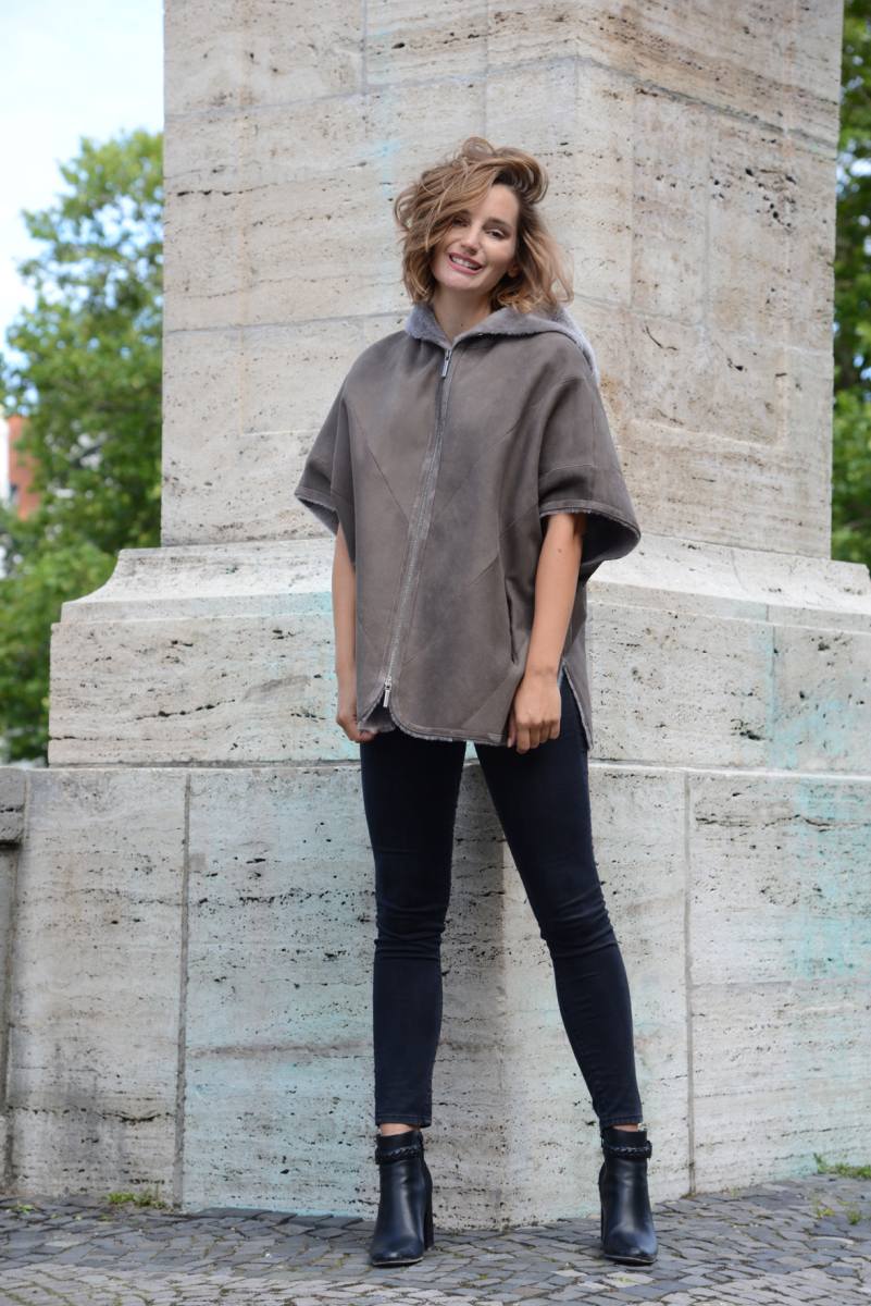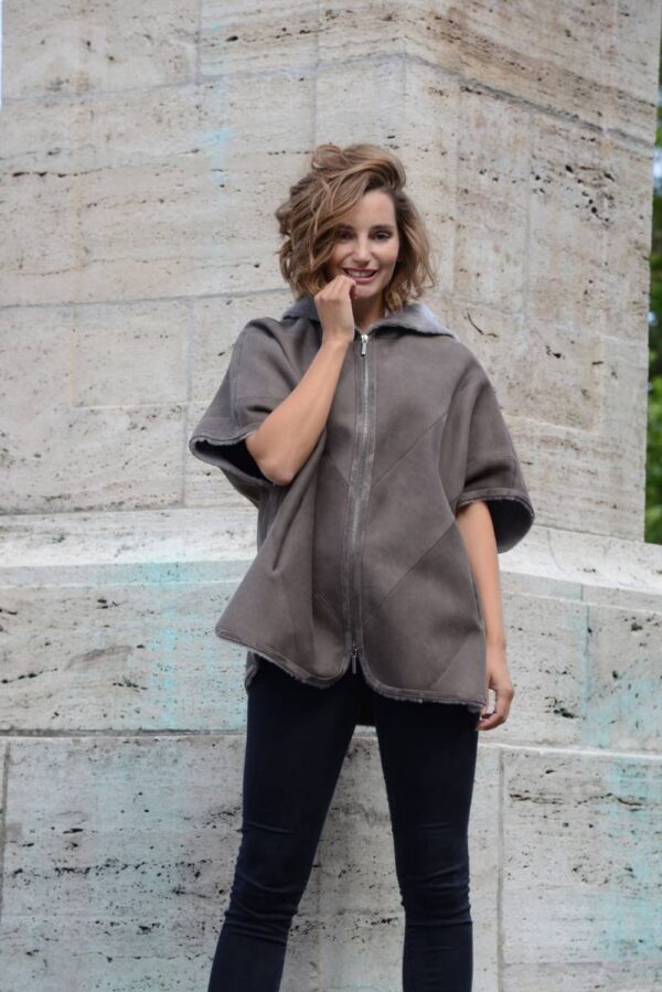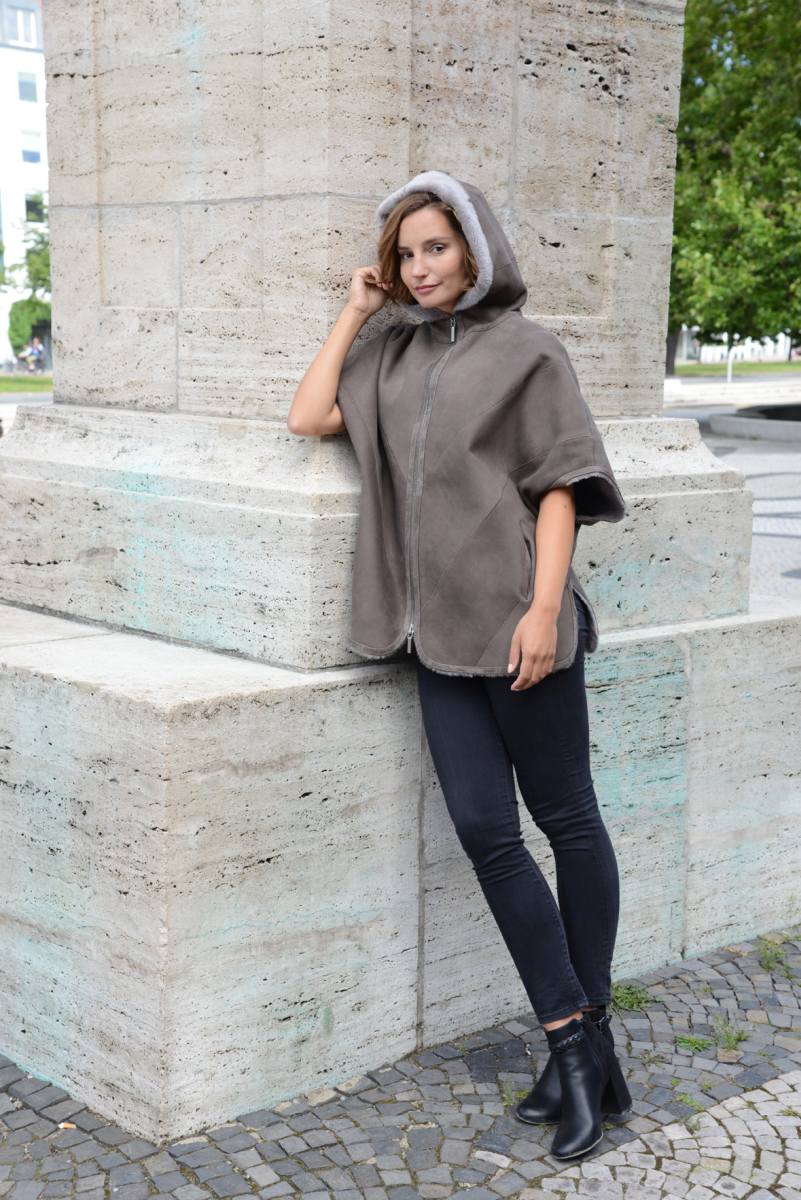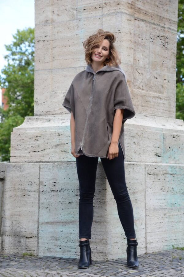 Cape aus leichtem Laconlamm in der Farbe Amethyst. Mit einer großzügigen Kapuze. Das Cape wird vorn mit einem Reißverschluss geschlossen.