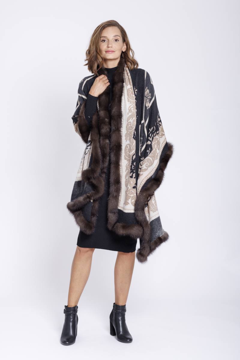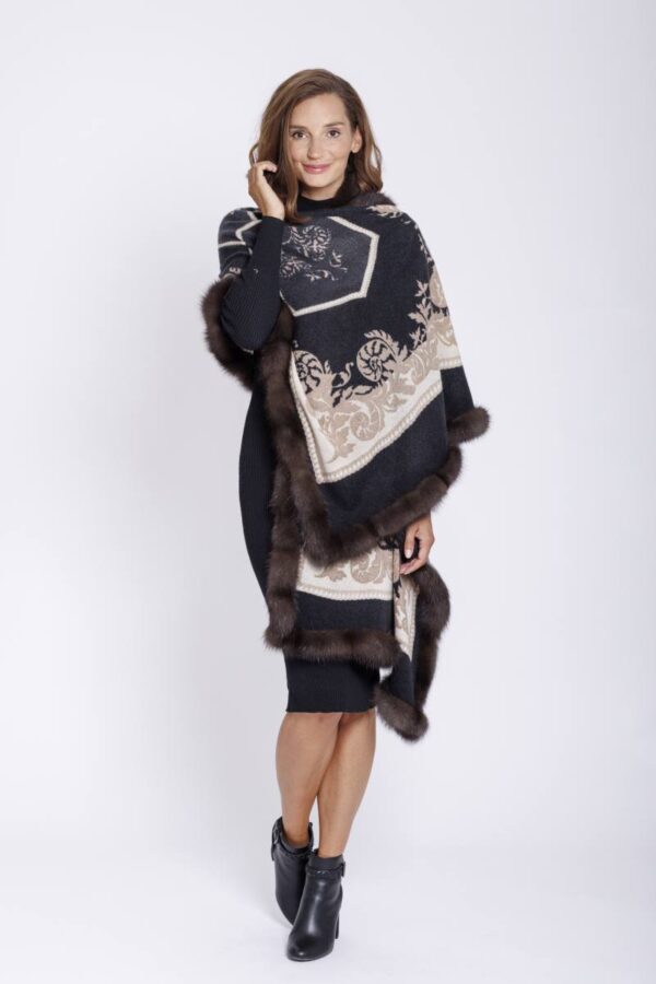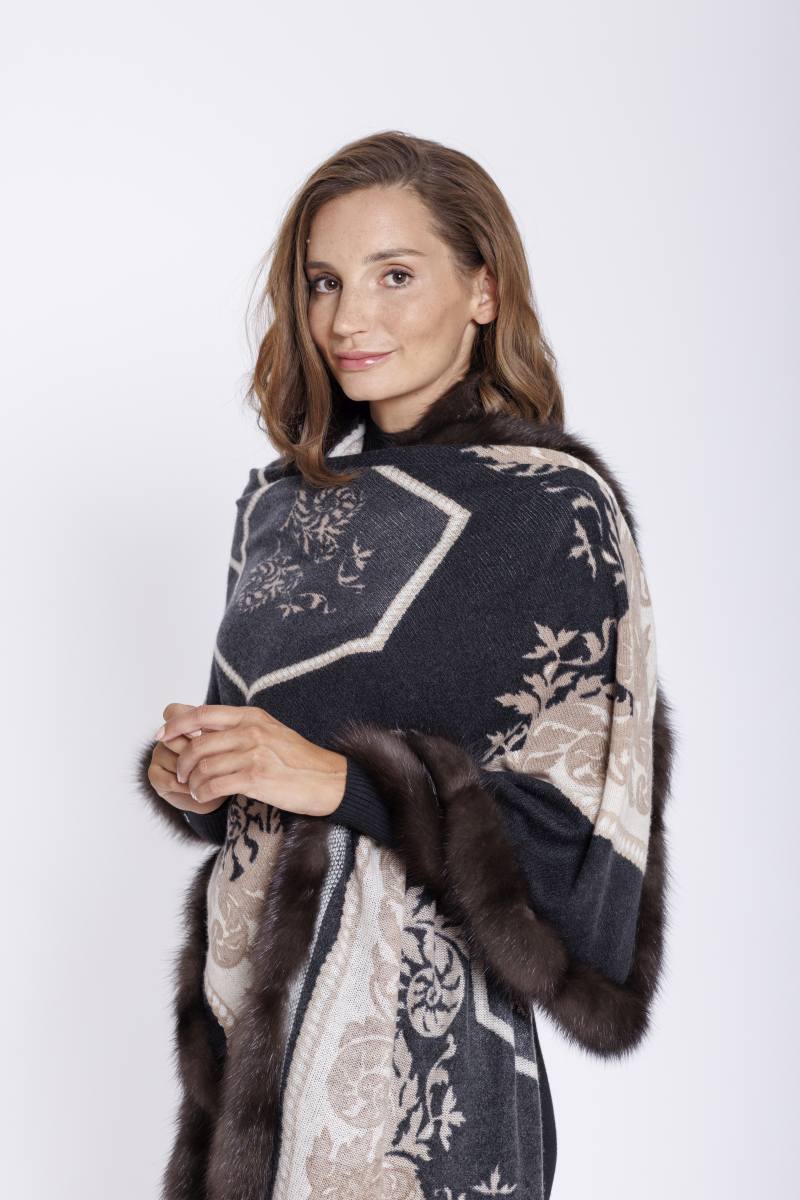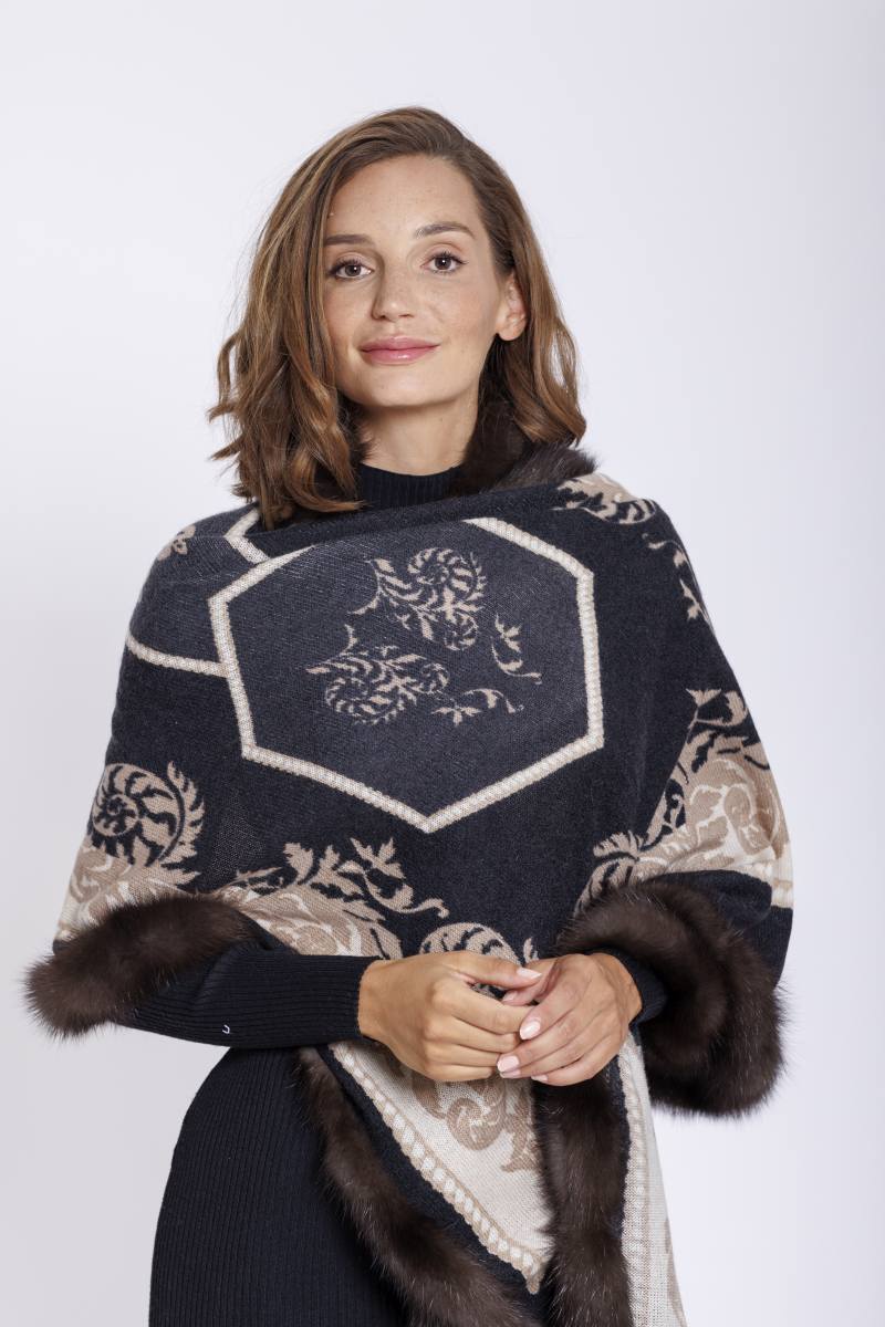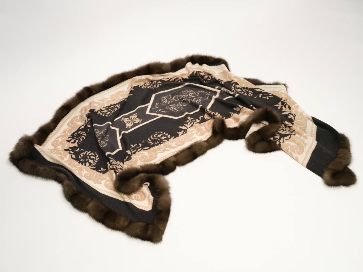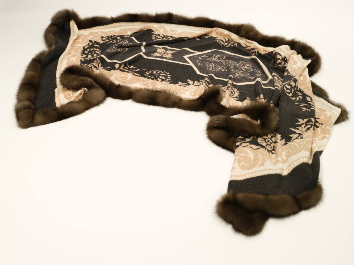 Hochwertiges Tuch aus 100% Cashmere in der Farbkombination schwarz mit beige und dunkelblau. Eingefasst mit russischem Zobel Dark. Größe 160×80 cm