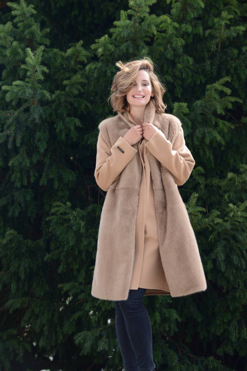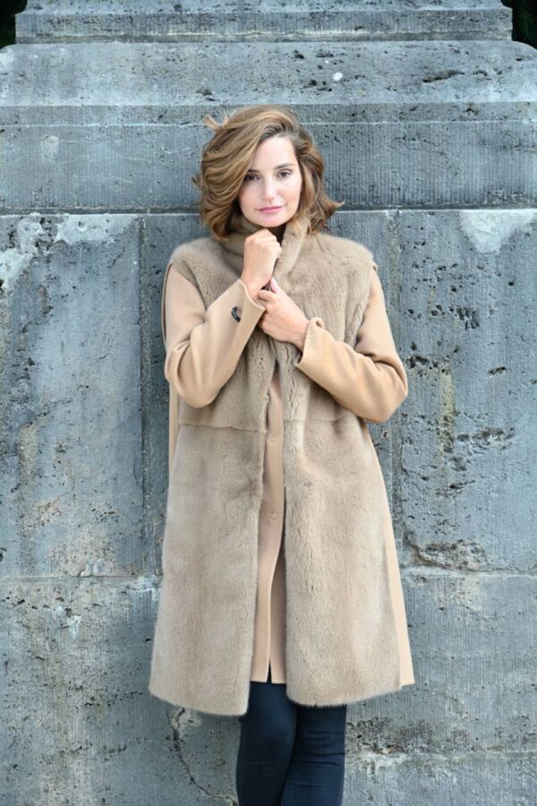 Feines Chasuble aus Loro Piana Cashmere mit Nerz Honey von Manzoni 24. Lässig getragen als Einzelstück oder mit dem passenden Mantel M 507 Farbe Honey. Der Double Face Cashmere ist ungefüttert gearbeitet und handgenäht.