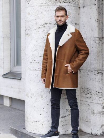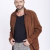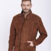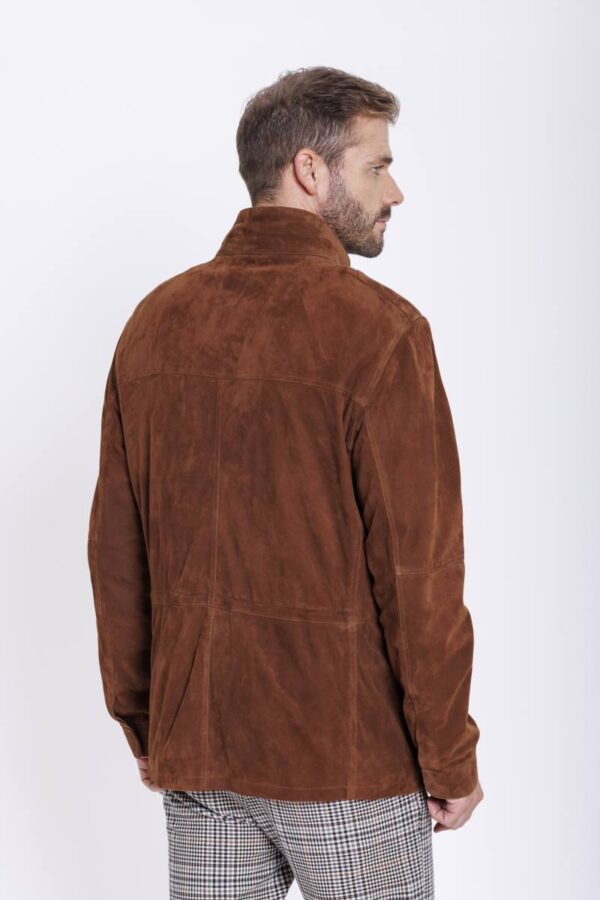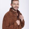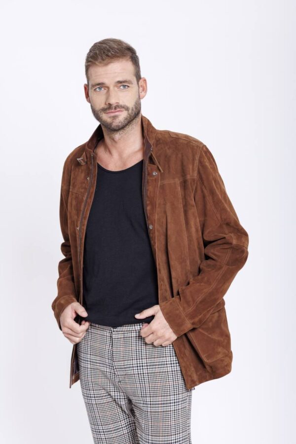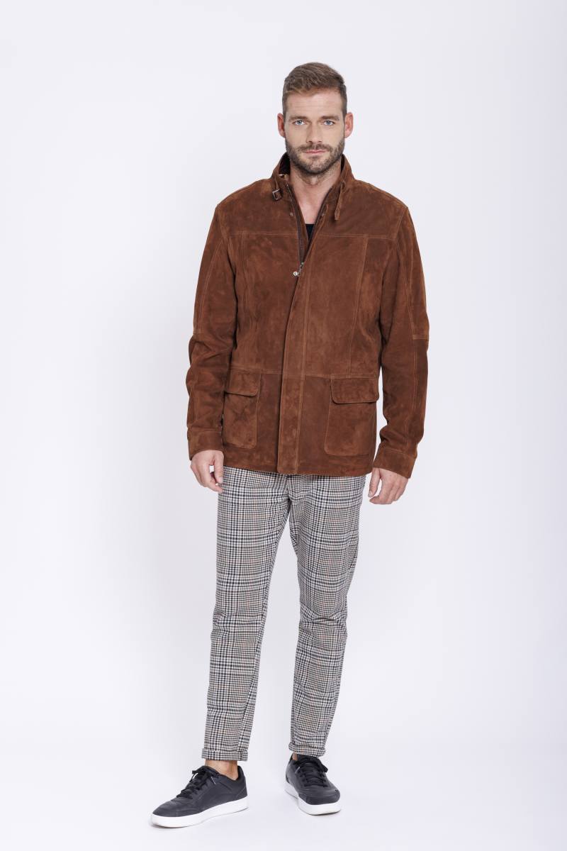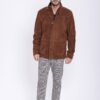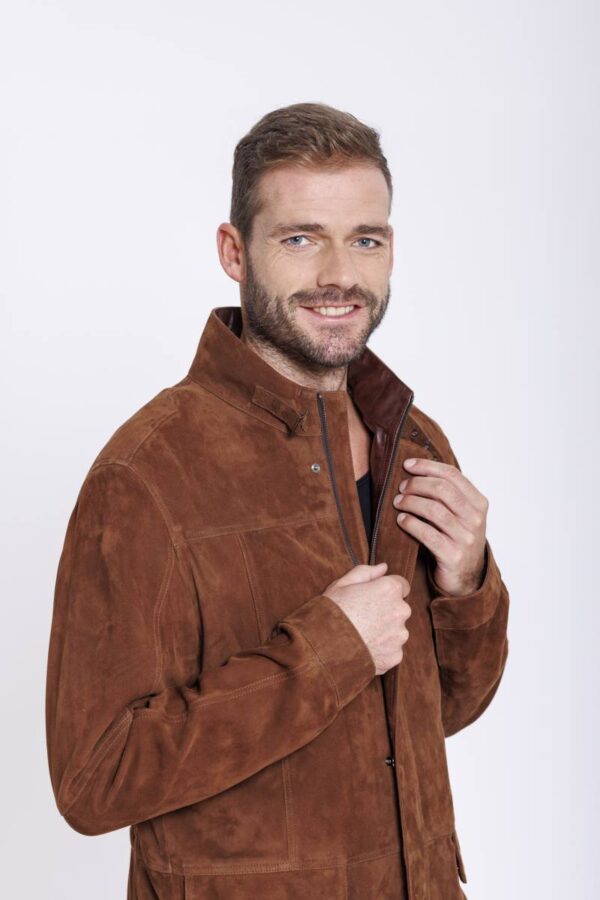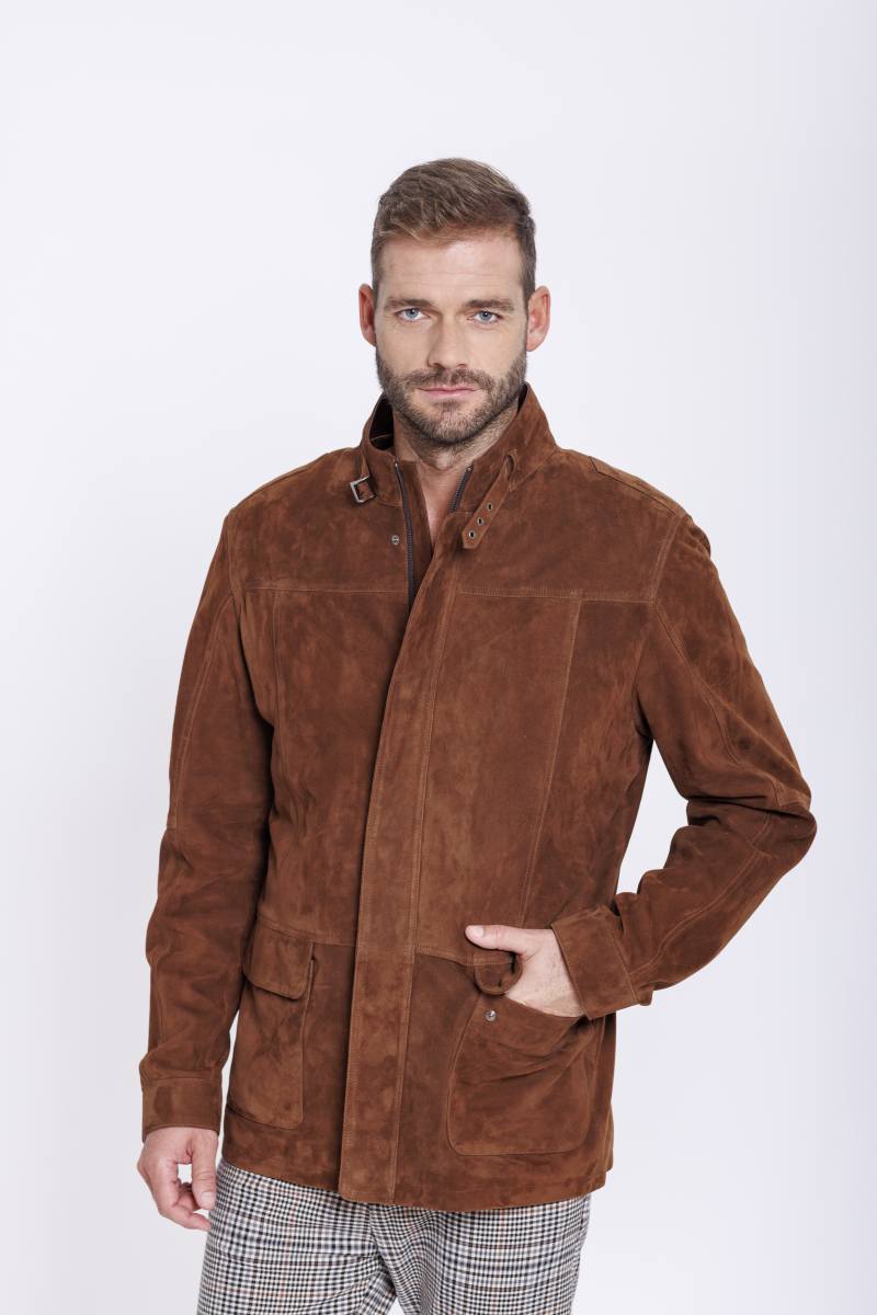 Sportliche Lederjacke aus weichem Ziegenvelour in der Farbe Whisky. Die Jacke verfügt über aufgesetzte Taschen und einen Riegel am Stehkragen.