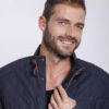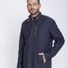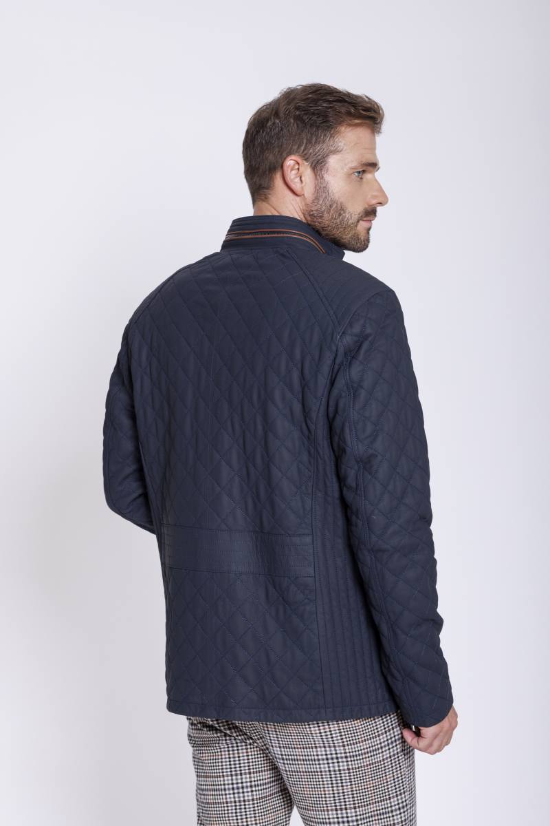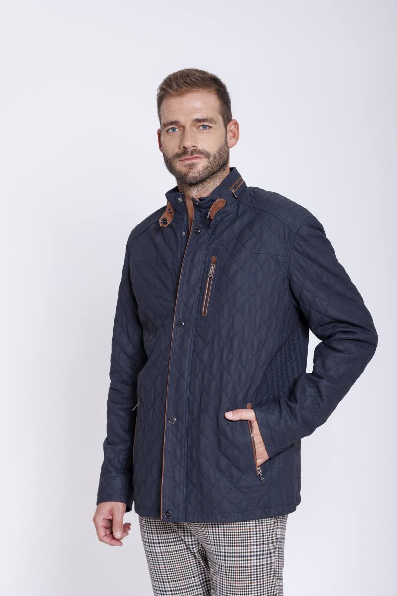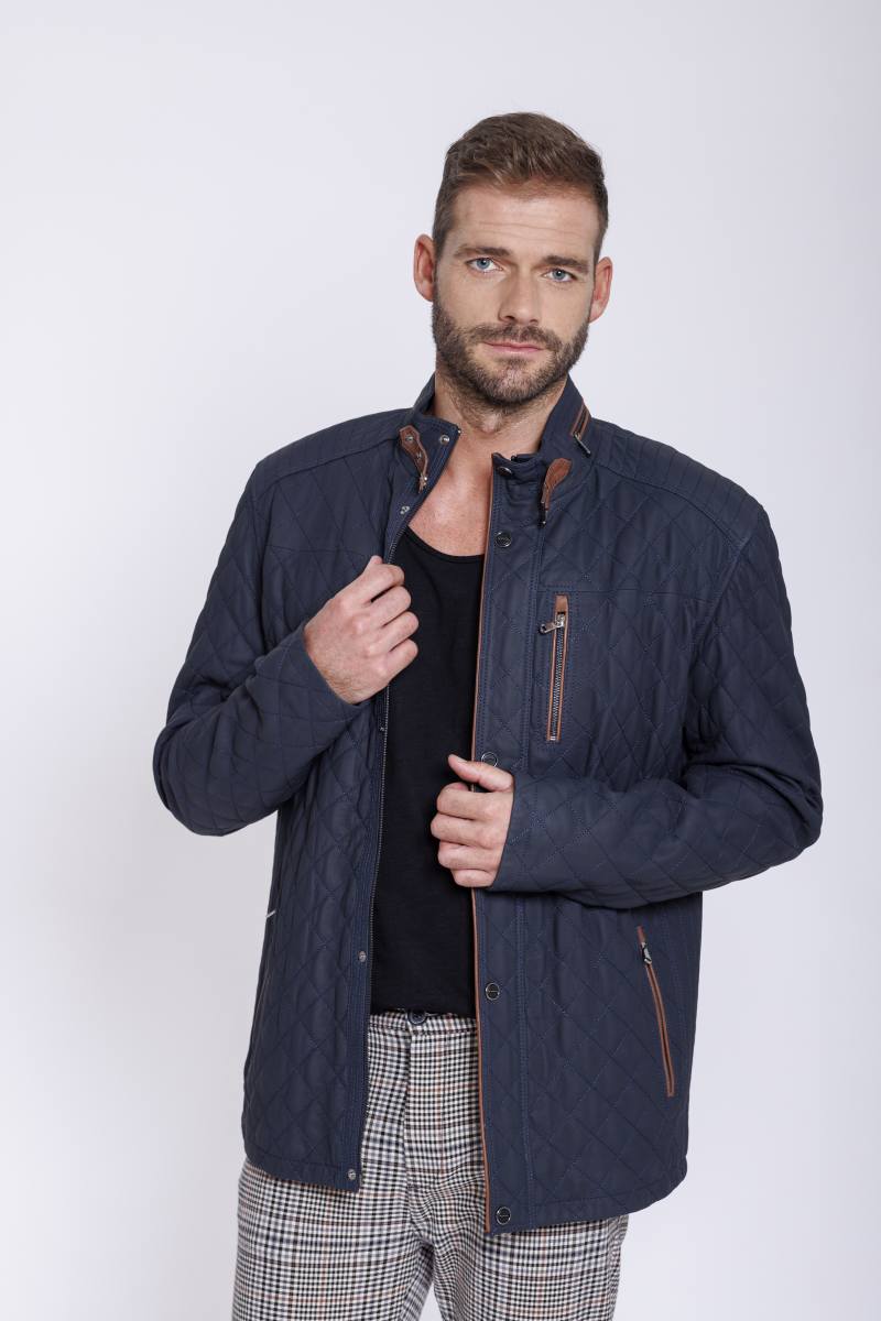 Sportliche Herrenjacke aus gestepptem Lammnappa Dunkelblau Navy, Cognac Farben abgesetzt am Kragen und an der Reißverschlusstasche im Vorderteil. Vorn mit Reißverschluss und einer Blende mit Druckknöpfen.