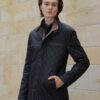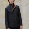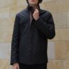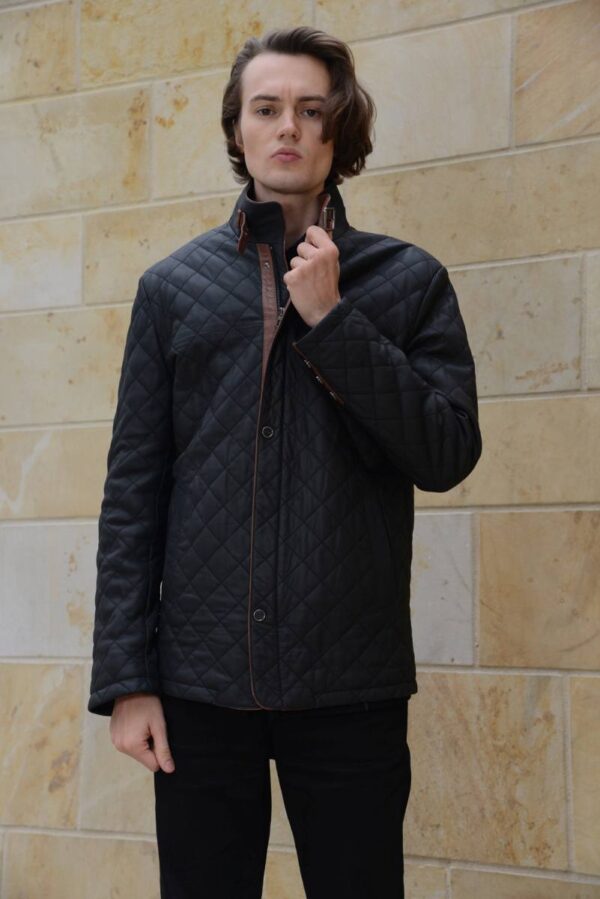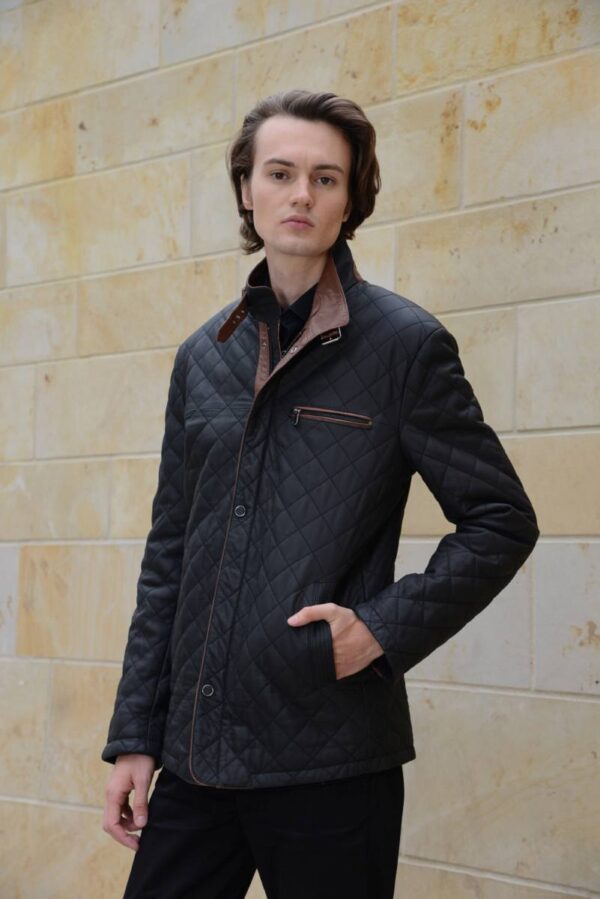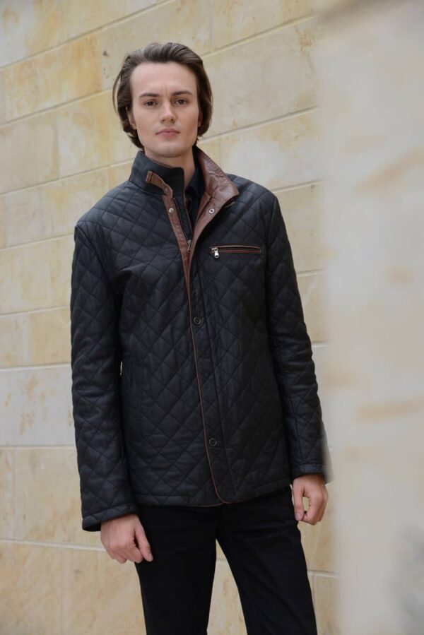 Sportliche Herrenjacke aus gestepptem Lammnappa in schwarz oder Dunkelblau, Cognac Farben abgesetzt am Kragen und an der Reißverschlusstasche im Vorderteil. Vorn mit Reißverschluss und einer Blende mit Druckknöpfen.