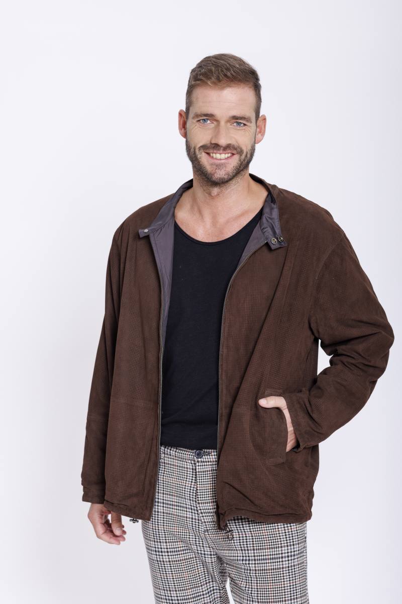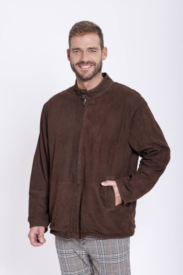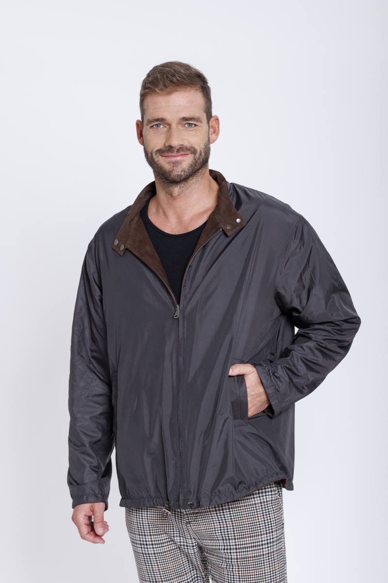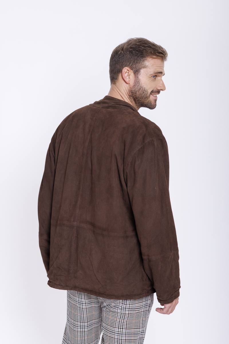 Leichte Lederjacke aus Ziegenvelour Perfor. Wendbar gearbeitet mit einer Seite aus Regenseide und einer perforierten Lederseite. Mit Reißverschluss zum schließen.