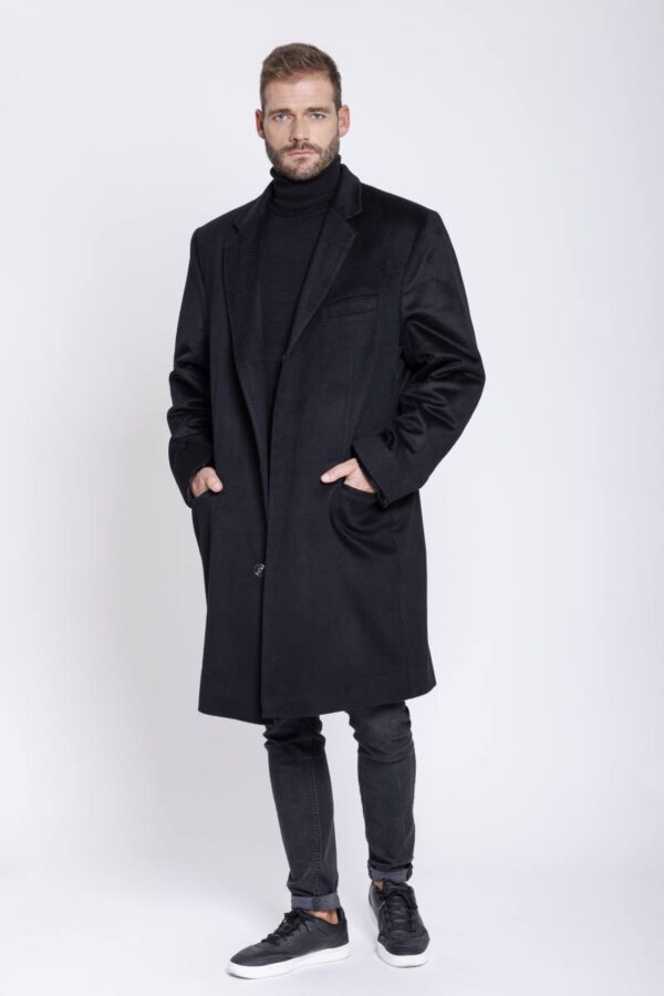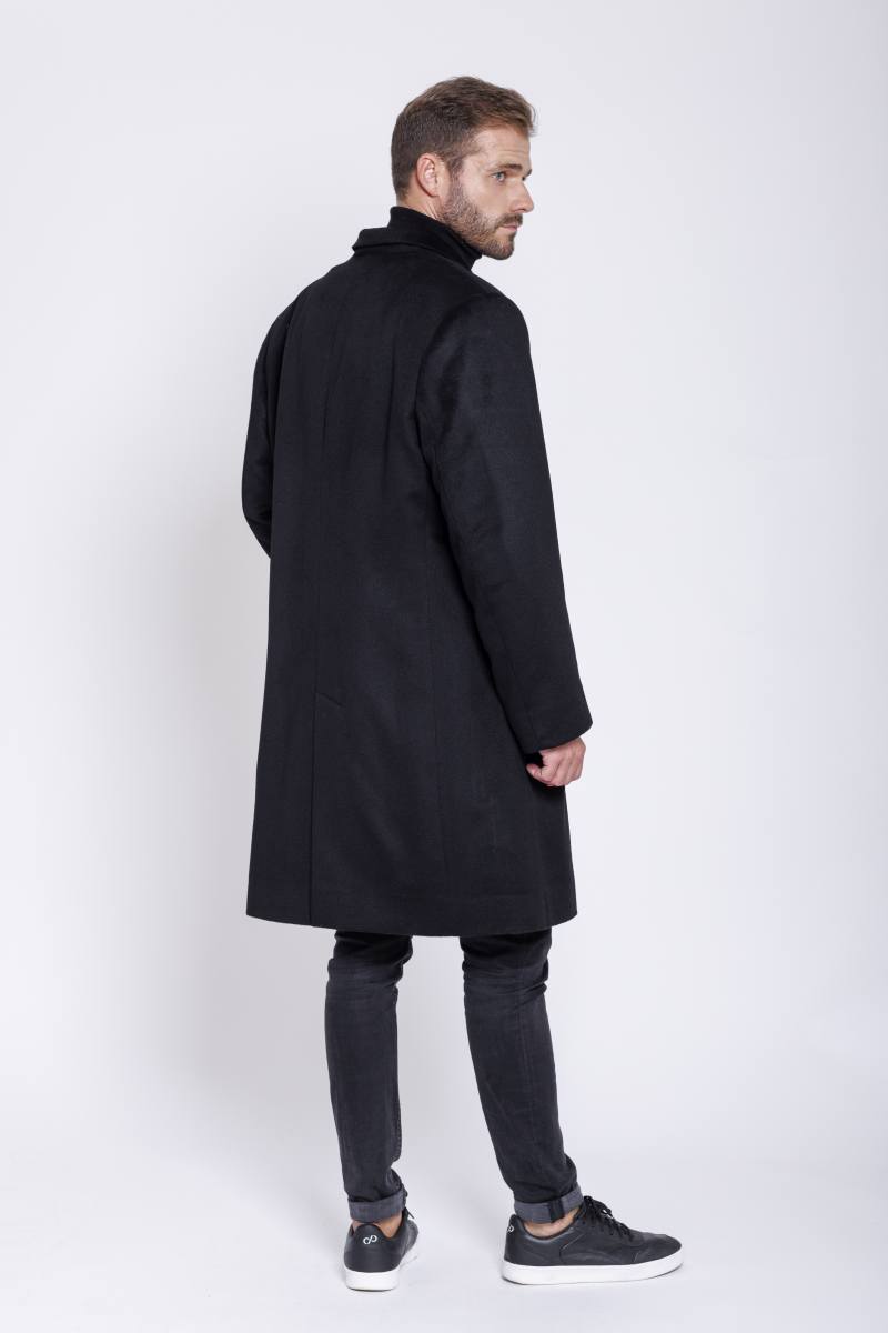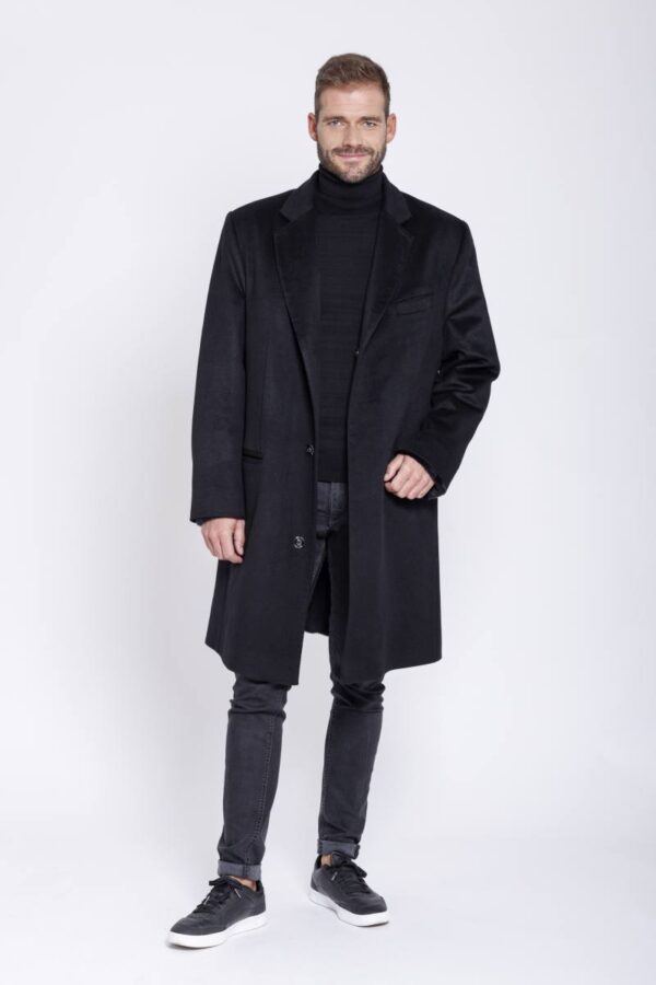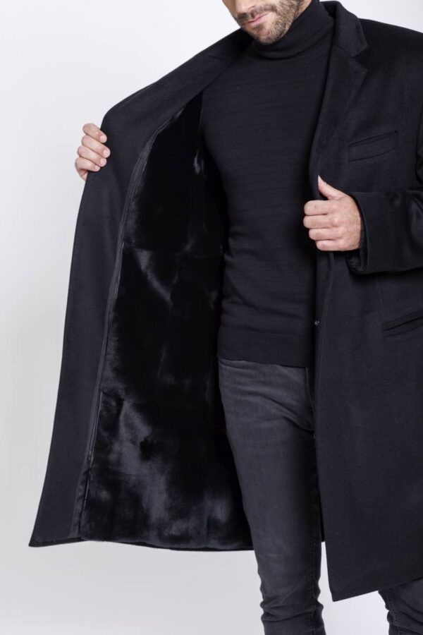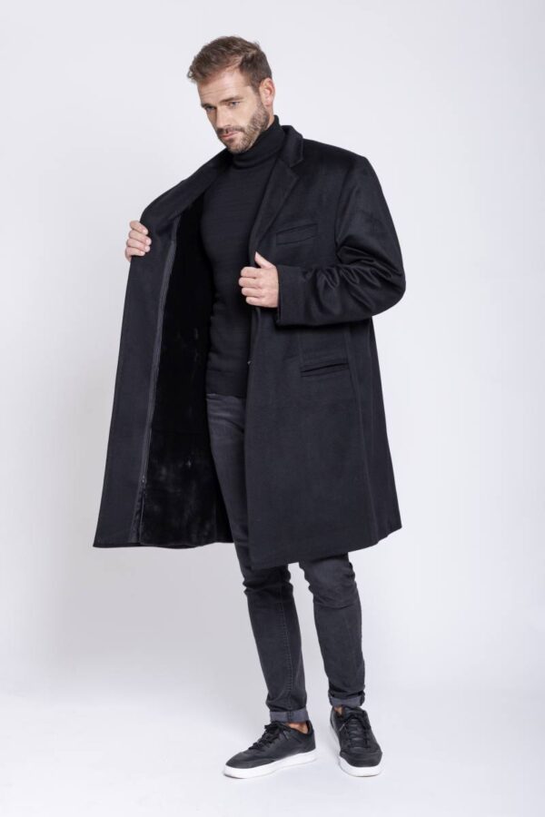 Eleganter Herrenmantel aus reinem schwarzen Cashmere, gefüttert mit leichtem Samtwiesel. Das Innenfutter ist mit einem Reißverschluss versehen und kann ganz einfach aus dem Mantel entnommen und bei Bedarf wieder eingefügt werden. Das Innenfutter, wie auch der Mantel, ist mit einer Reißverschluss Innentasche versehen.