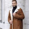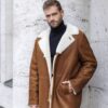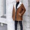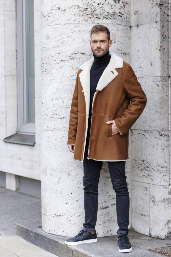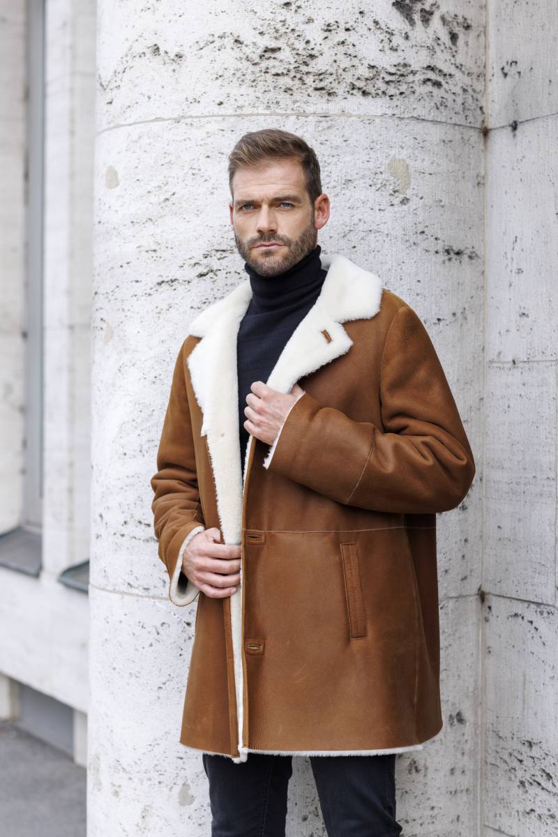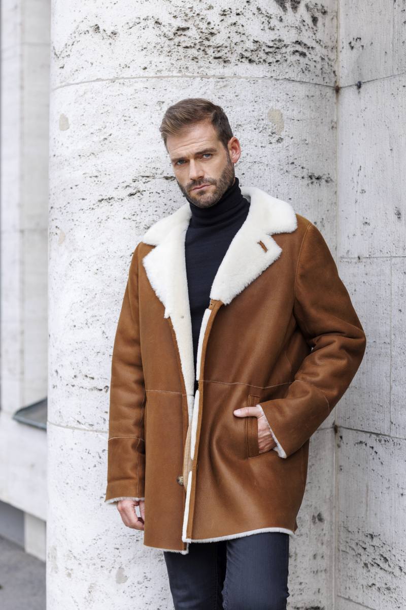 Klassische Lammfelljacke aus leichtem und robustem Merinolamm in der Farbe Cognac mit heller Wolle. Die Jacke wird mit Knöpfen geschlossen und hat einen großen Reverskragen.