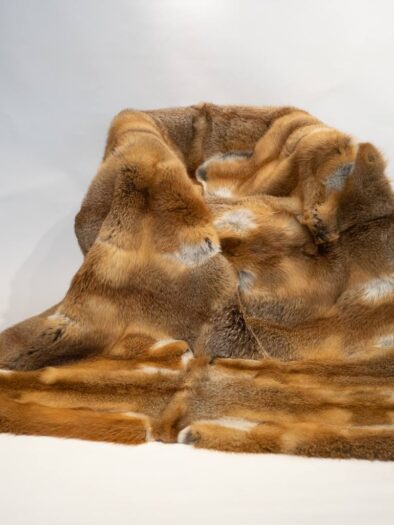Leichte Kanindecke in der Farbe dunkelblau. In die Decke wurden als optisches highlight Nerzteile in cremeweiß und verschiedenen blautönen eingelassen. Die Decke ist 140cm x 200cm groß und mit dunkelblauem Wollstoff abgefüttert.