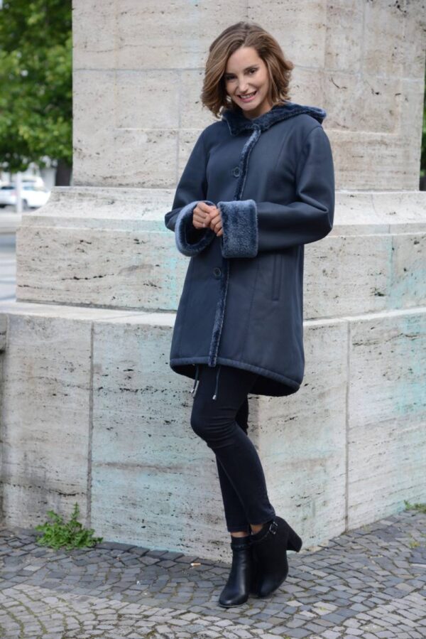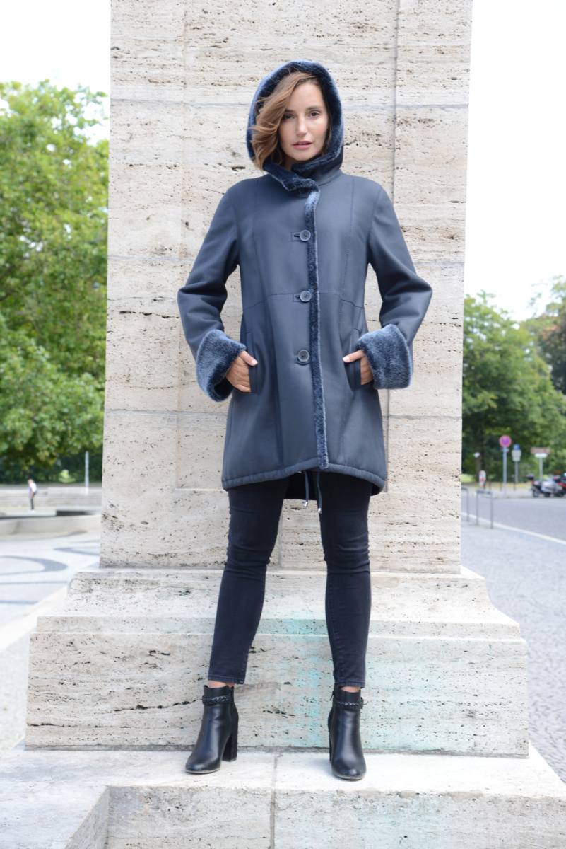 Sehr leichte Jacke aus Laconlamm im Parka Stil mit Kapuze. Farbe Blue brisa elegante mit Softnappierung.