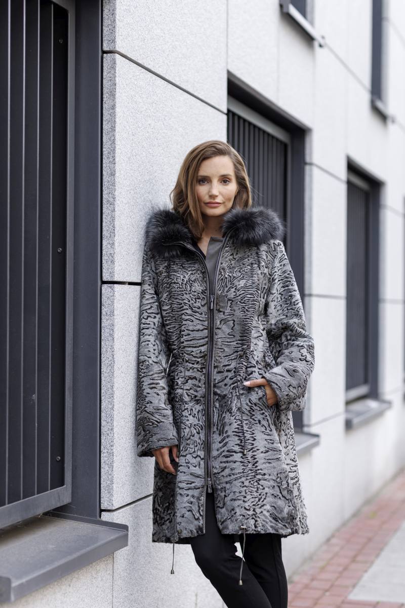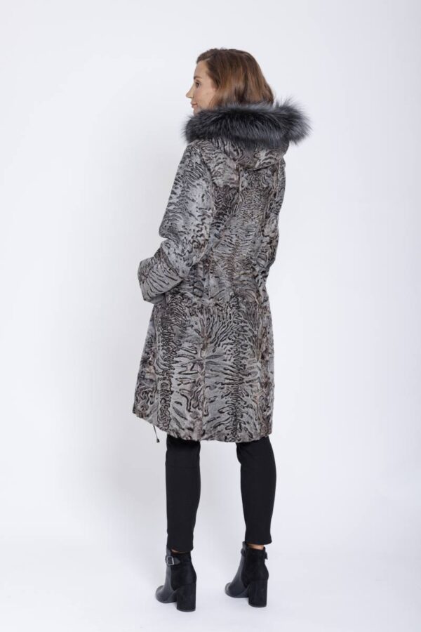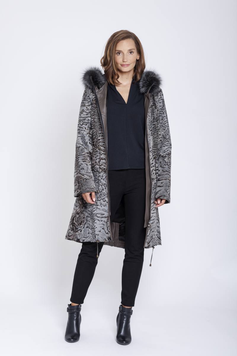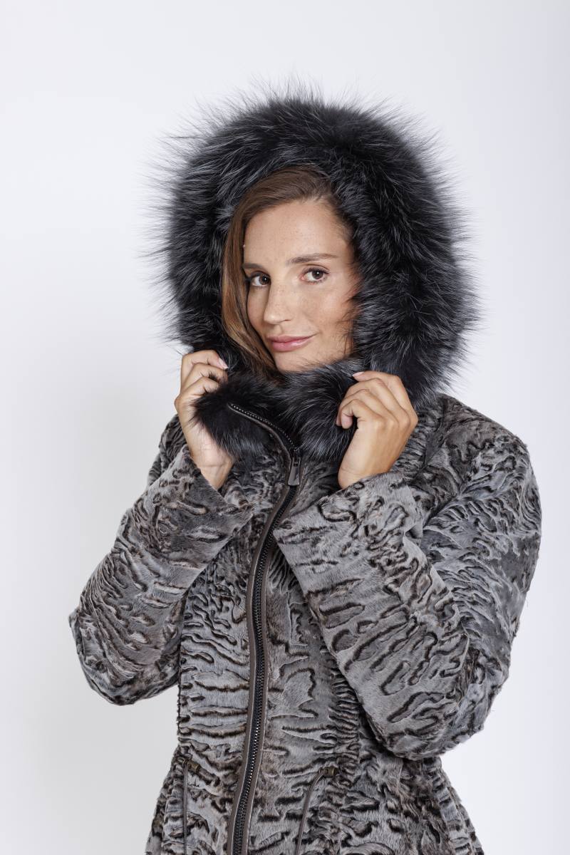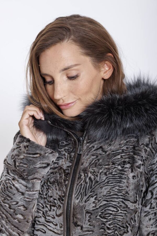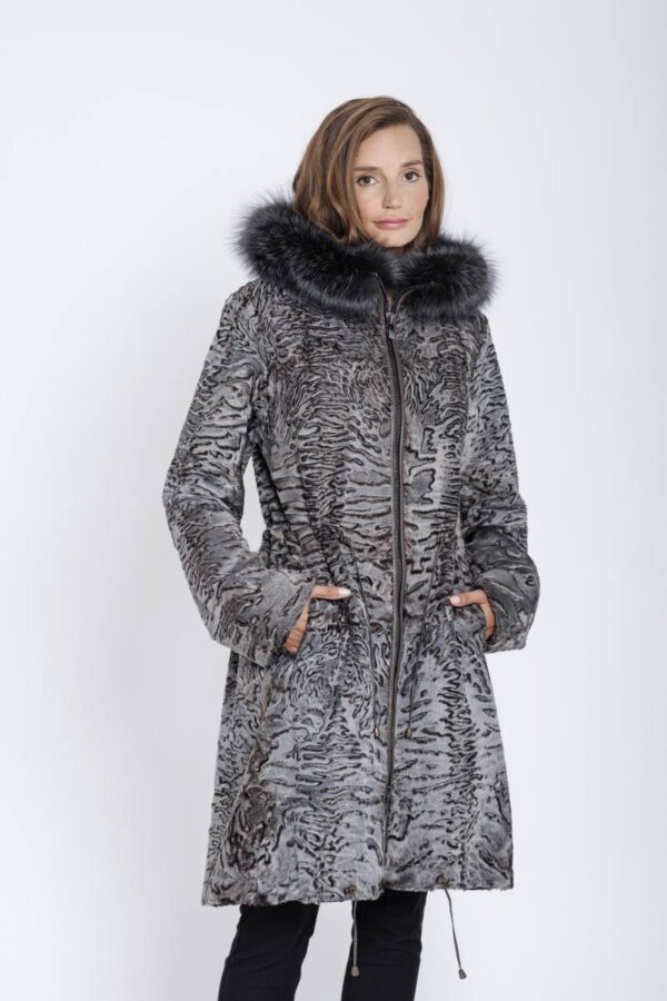 Sportlich edler Parka aus leichtem Swakara Persianer. Aufwendig in Tricolor Platin gefärbt. Der Parka hat einen Tunnelzug in der Taille und im Saum und wird mit einem zwei Wege Reißverschluss geschlossen. Die Kapuze ist mit einem passenden Silberfuchs verbrämt.