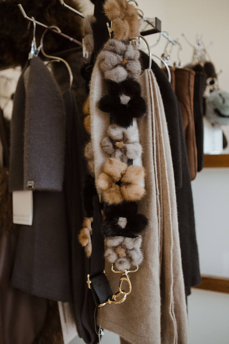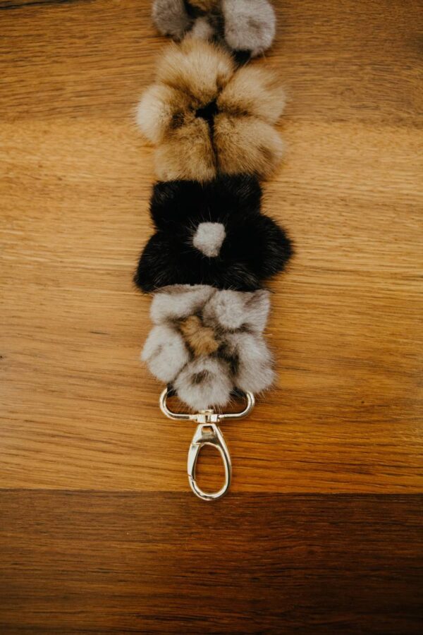 Taschengurt mit Nerzblumen. Farbe schwarz/beige/grau. Metallhaken in Farbe Gold.
