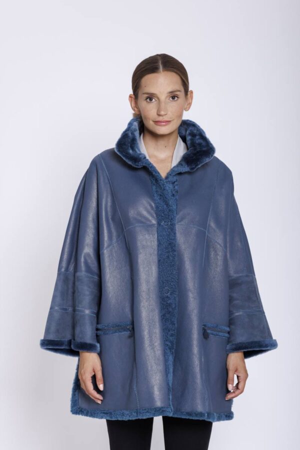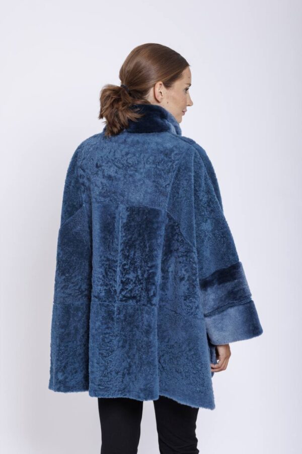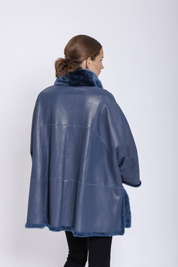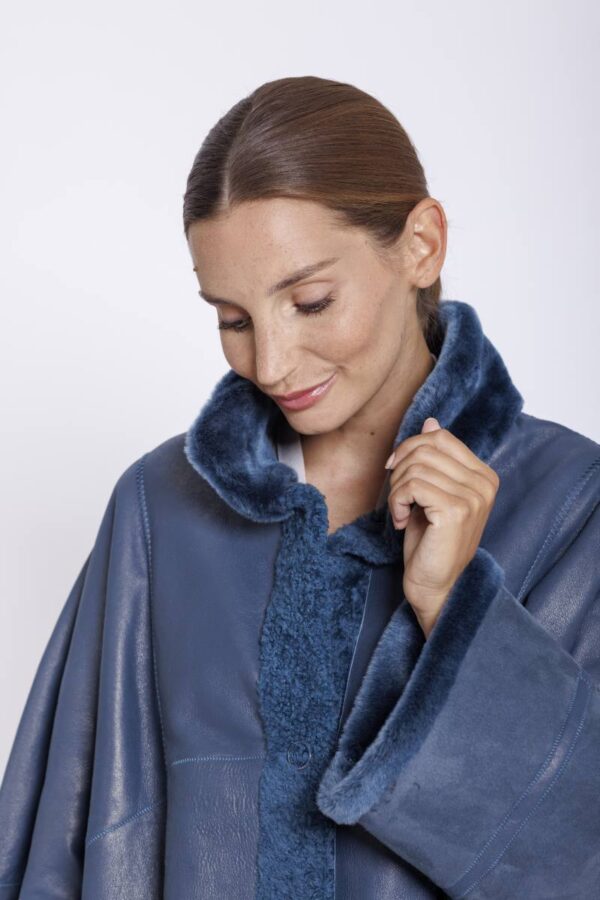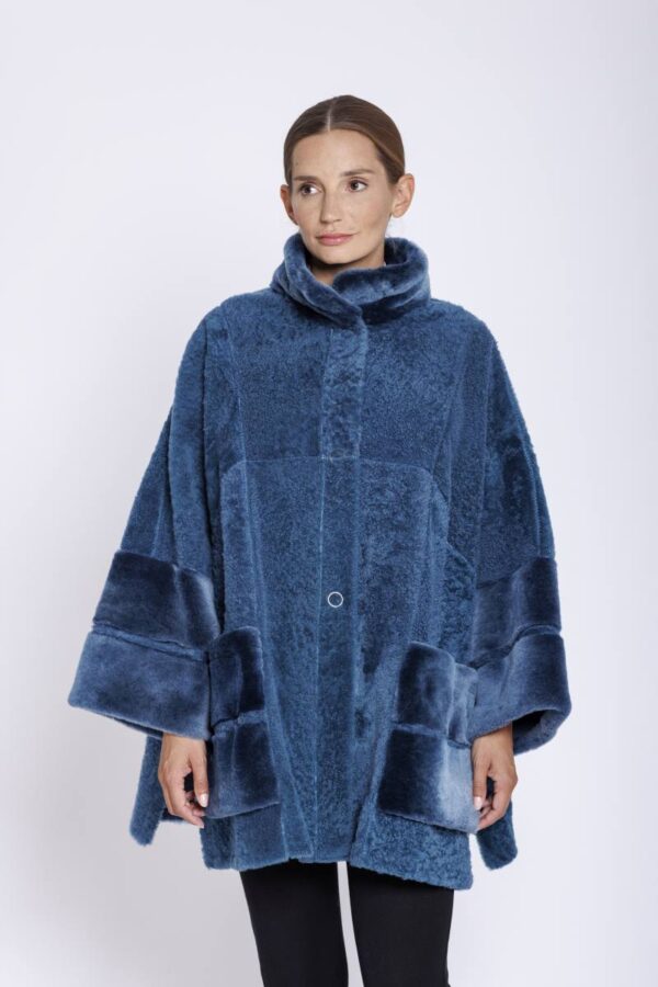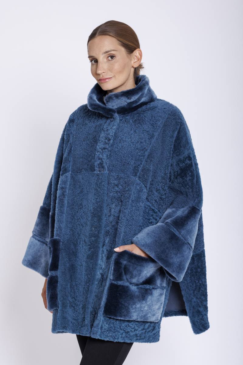 Die Wendejacke aus Merino und Curlylamm von Marester ist in Cape Form gearbeitet. Auf der Fellseite verzierten aufgesetzte Taschen und Druckknöpfe den Materialmix. Die Lederseite verfügt über eine Softnappierung.