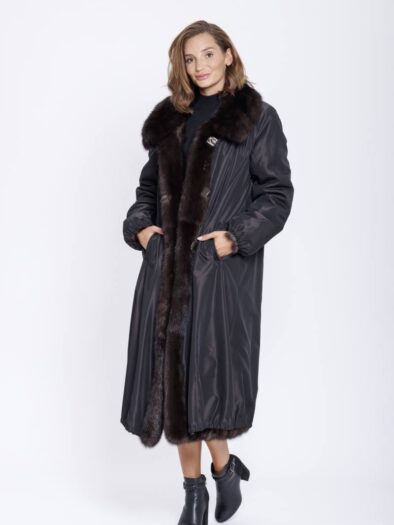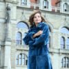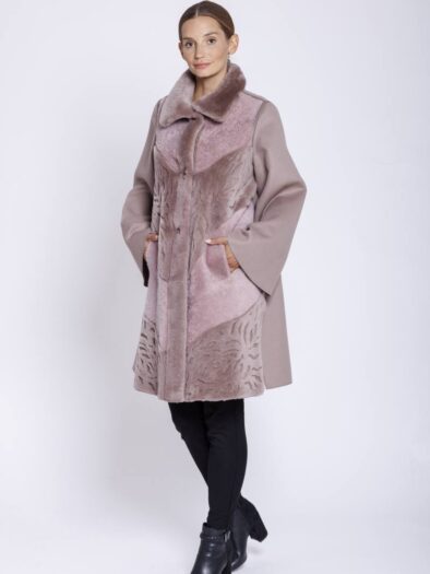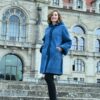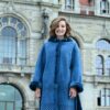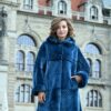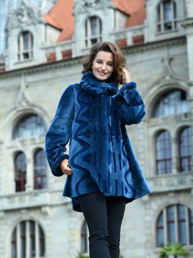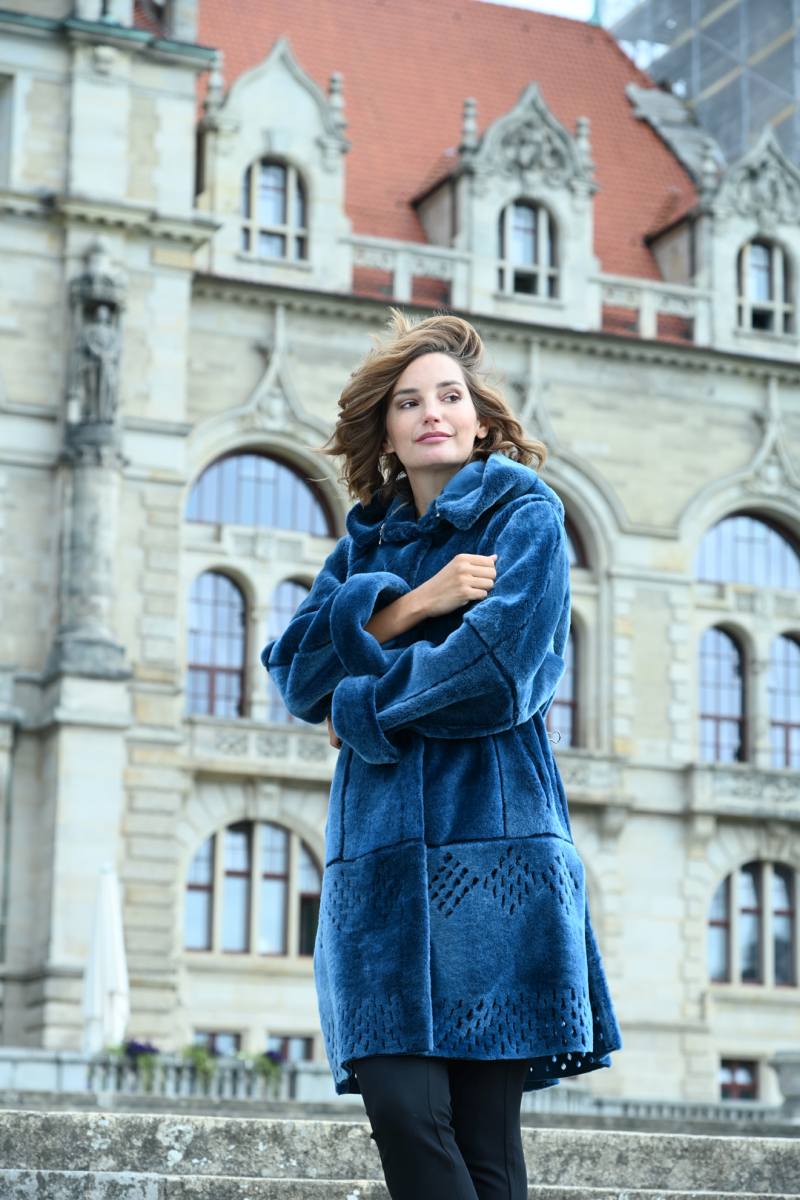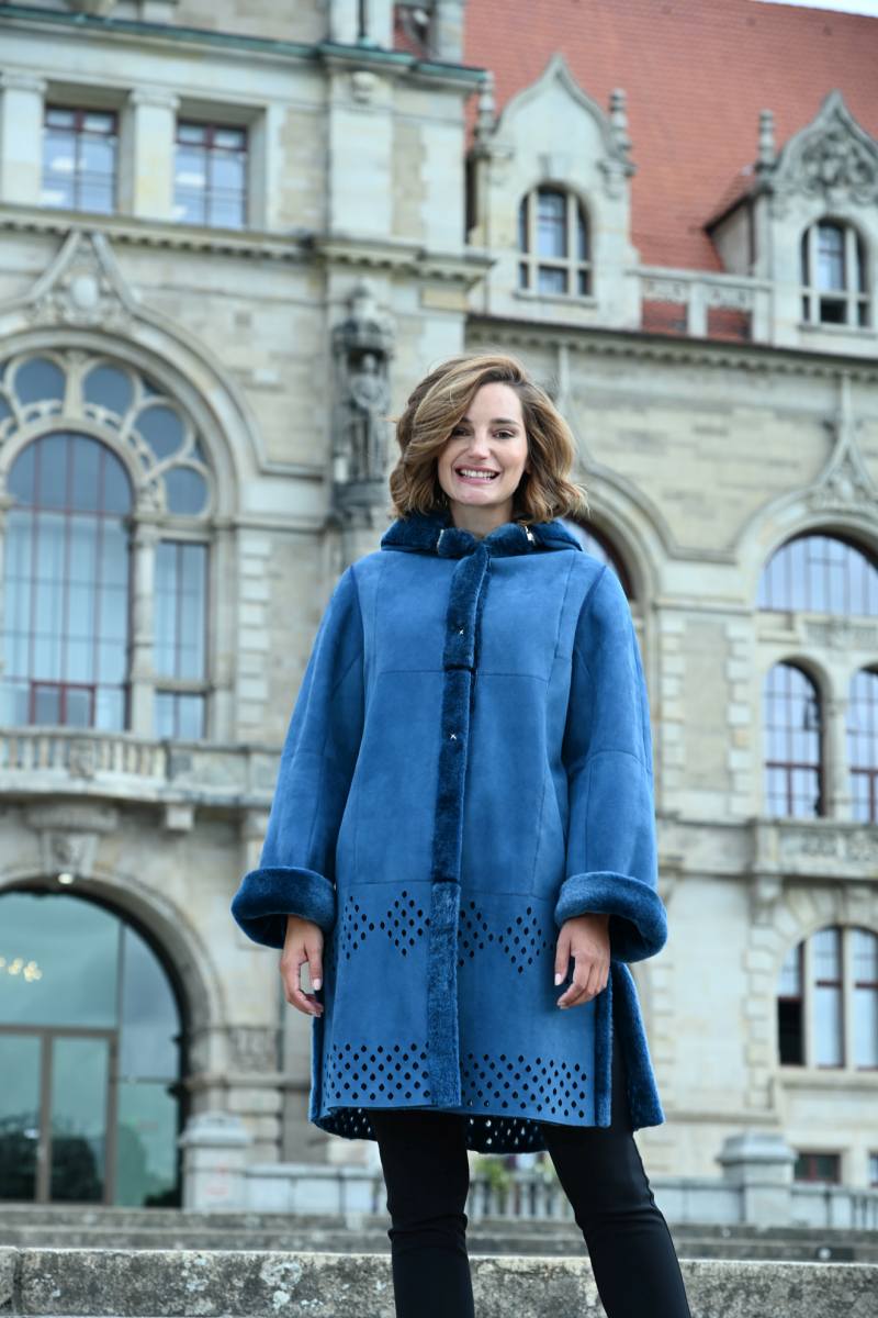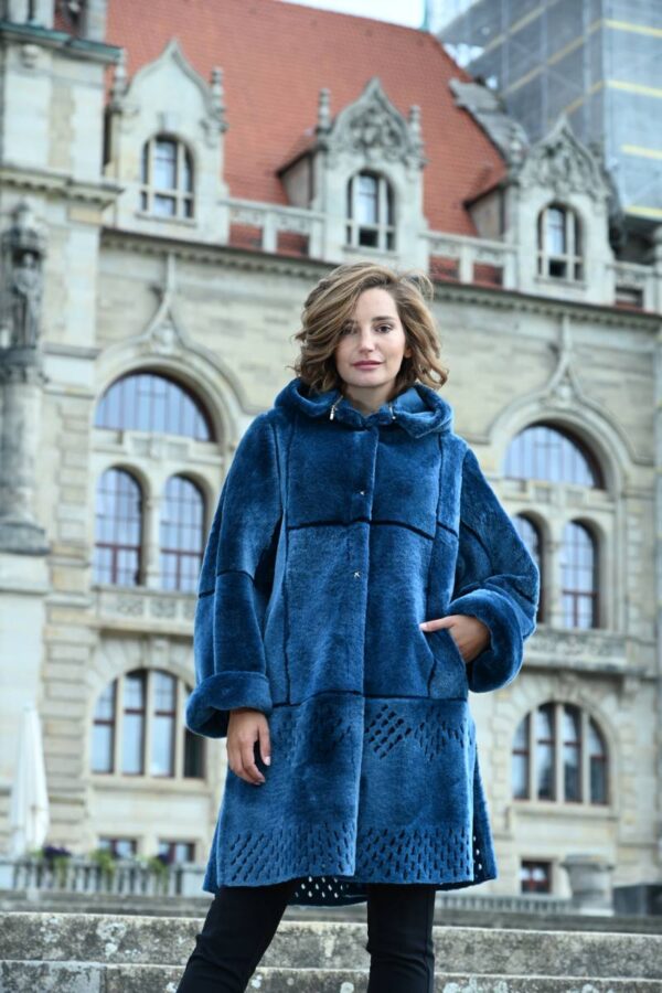 Feine und leichte Merinolamm Wendejacke von der Firma Marester in der Farbe Atlantide blau. Die Jacke hat eine abnehmbare Kapuze und ein Ausgestanztes Muster am Saum.