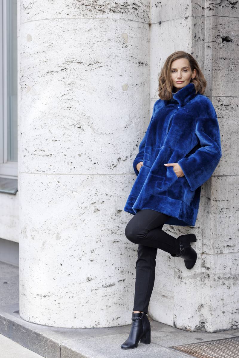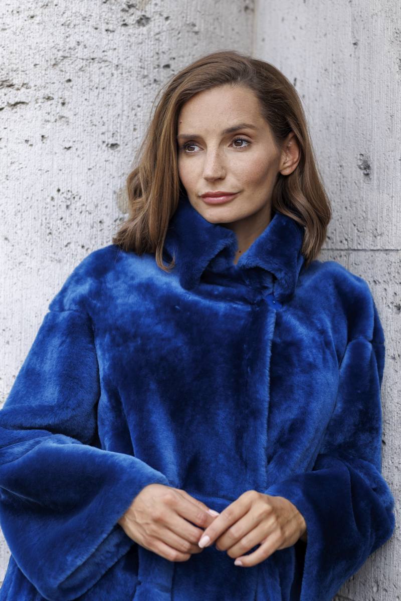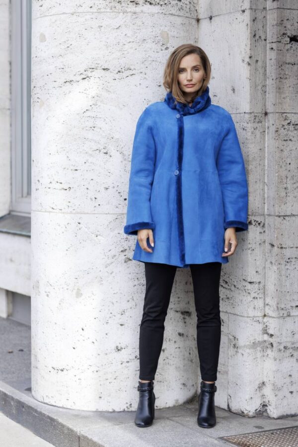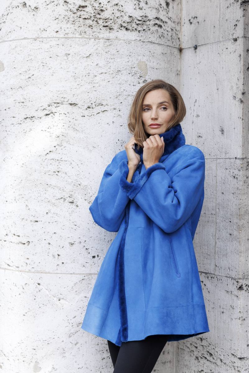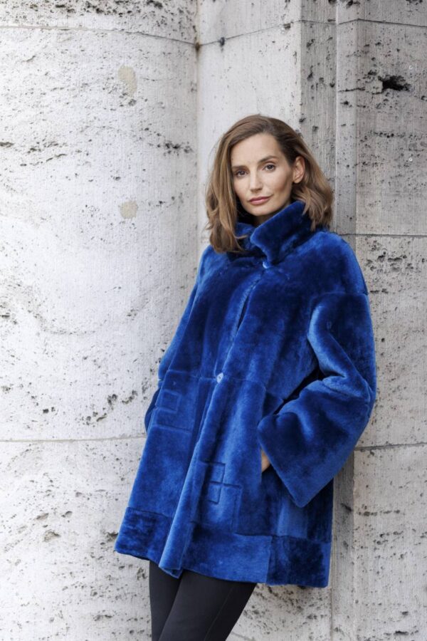 Feiner Merinolamm Wendemantel von der Firma Marester. California blau mit eingeschorenen Ornamenten.