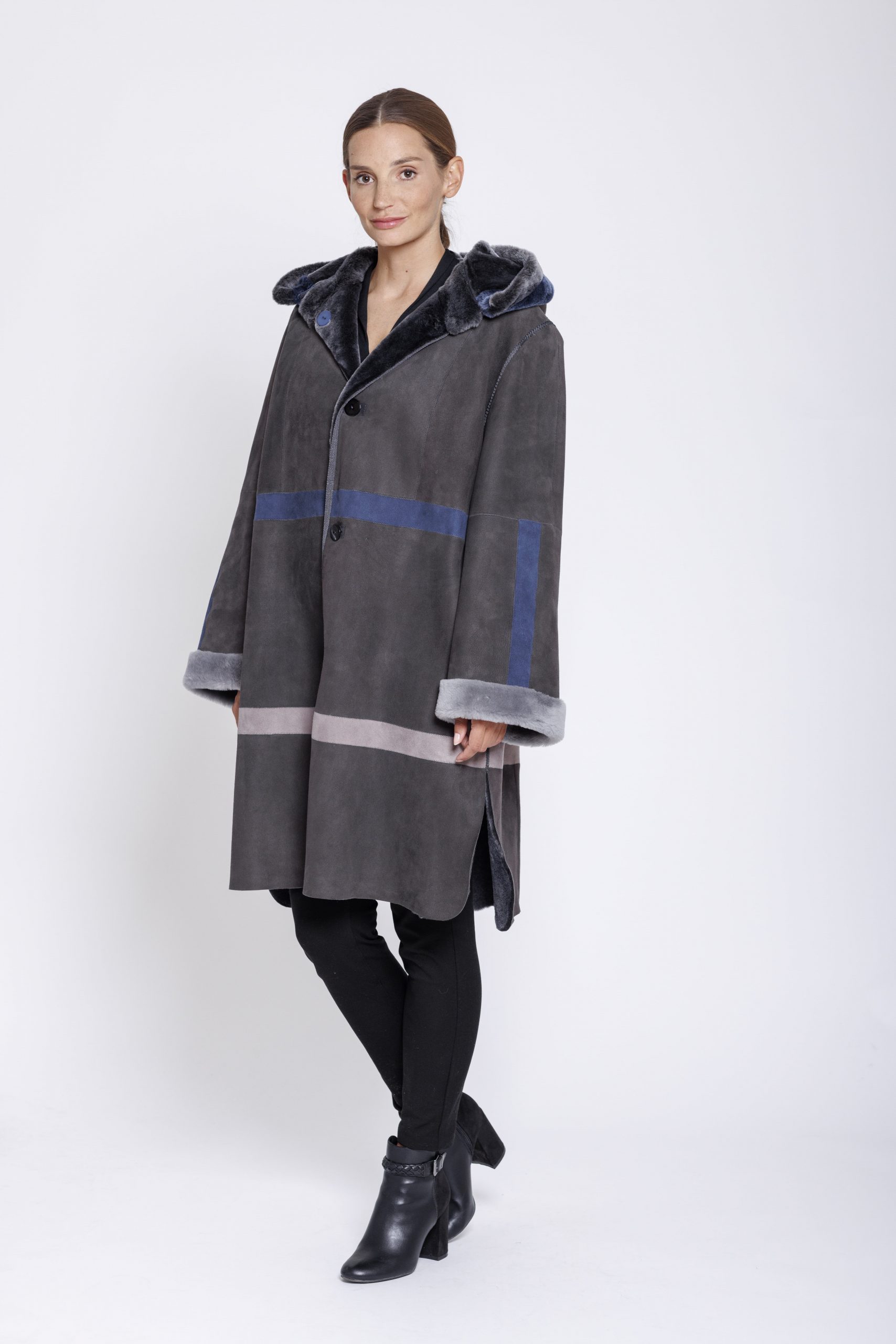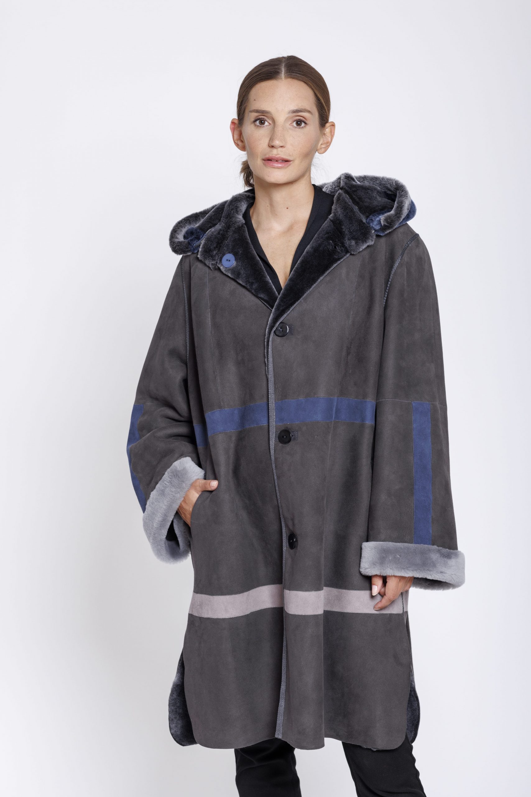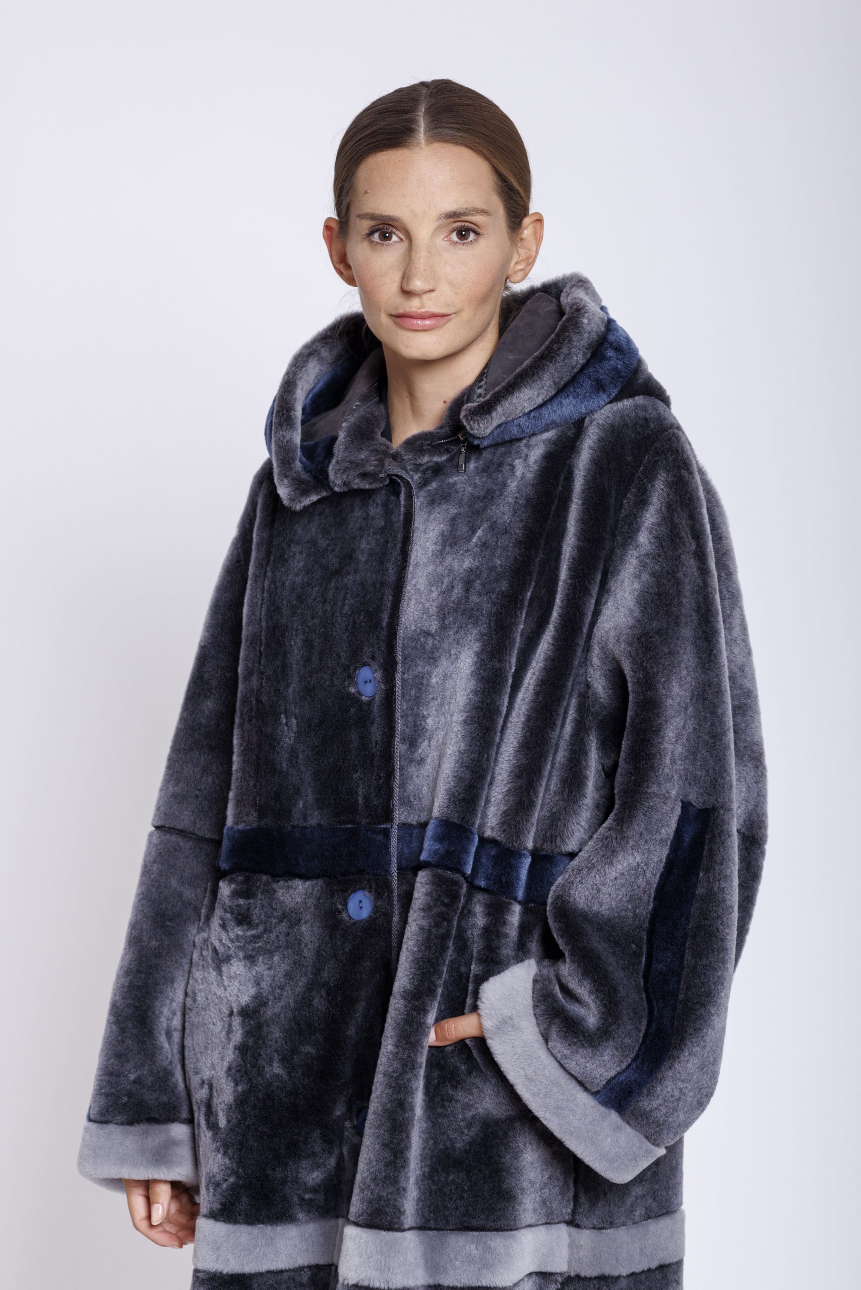 Feine und leichte Merinolamm Wendejacke von der Firma Marester in der Farbe Londra grau im Farbmix mit blau. Die sportlich geschnittene Jacke verfügt über eine abnehmbare Kapuze und abgerundeten Seitenschlitzen.