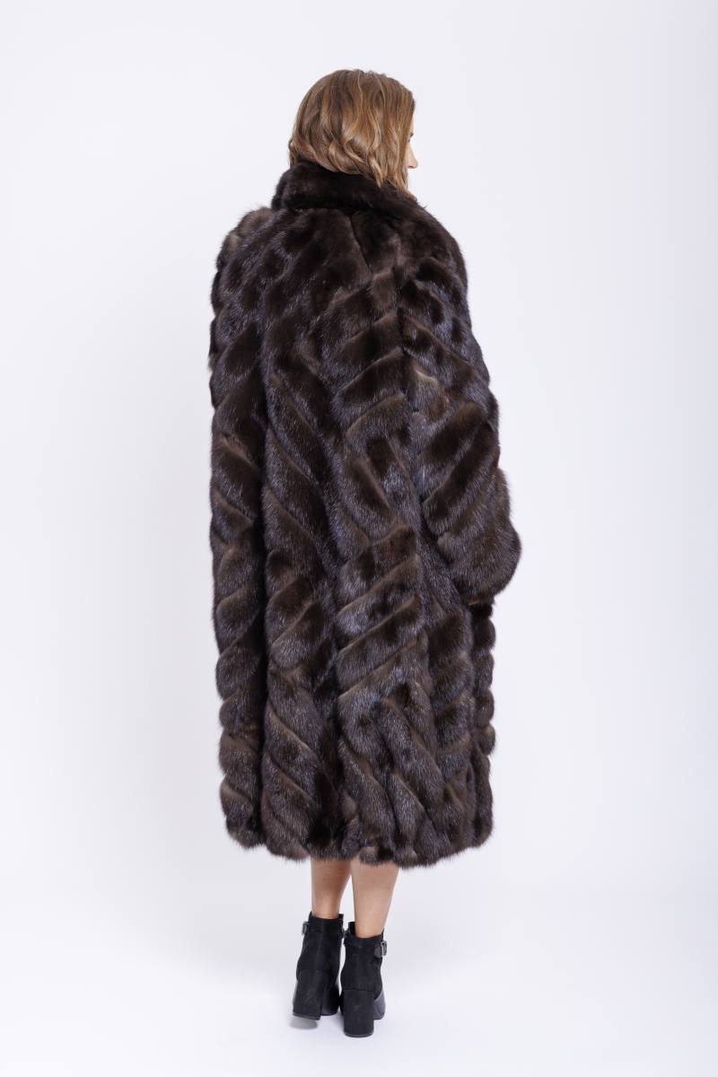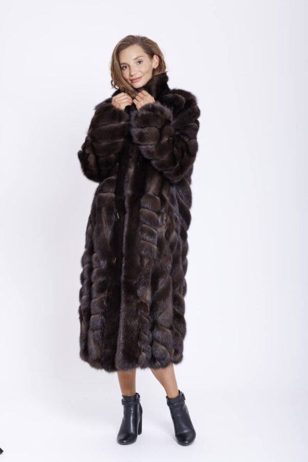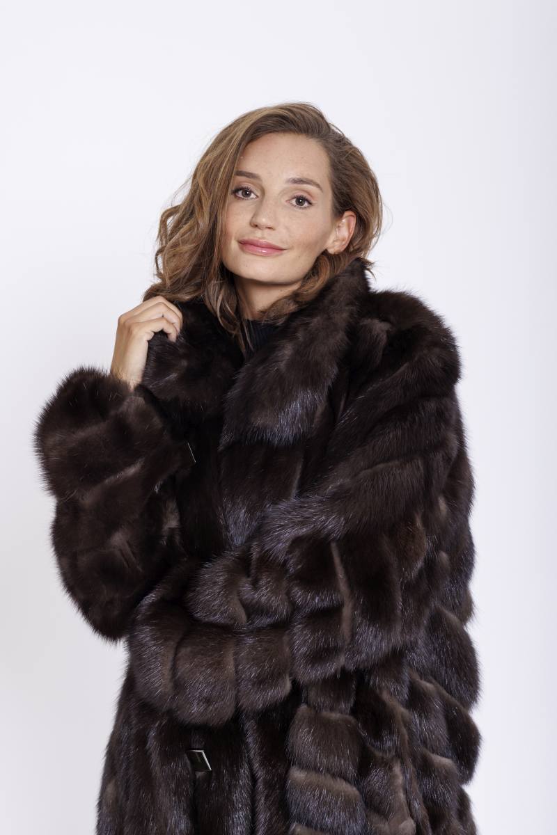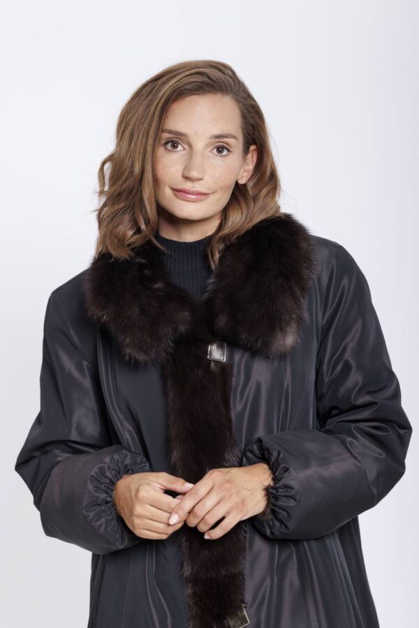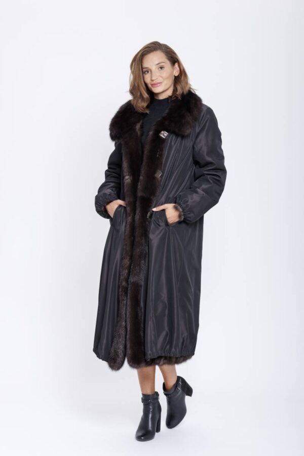 Langer Wendemantel aus Zobel mit einer Hülle aus Regenseide. Der Stoff ist Dunkelbraun und Wasserabweisend ausgerüstet. Auf der Fellseite ist der Zobel aufwendig in einer Schächtelopttik mit Leder verarbeitet. Der Mantel hat einen großen Kragen und schöpne Schmuckknöpfe.