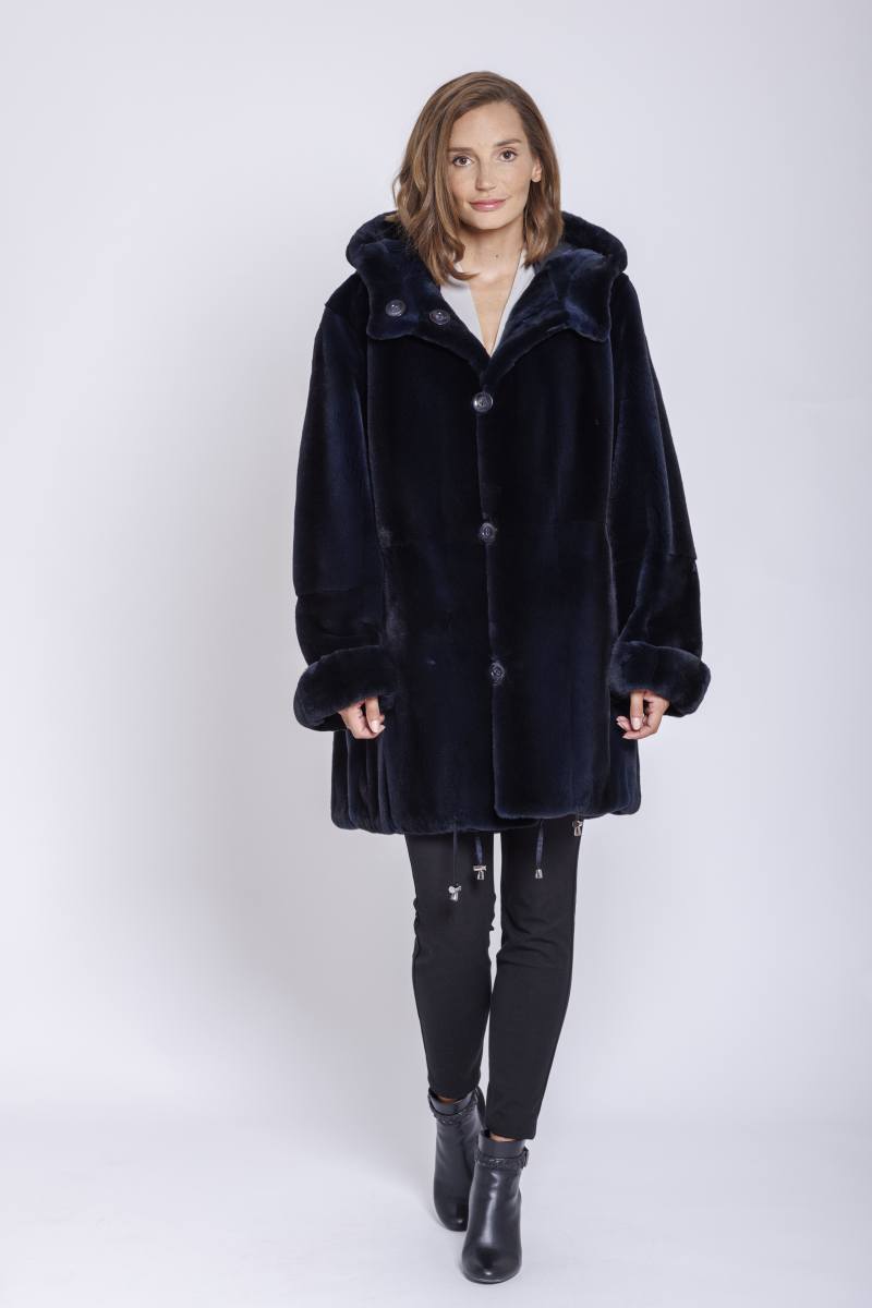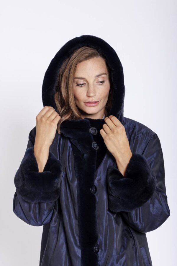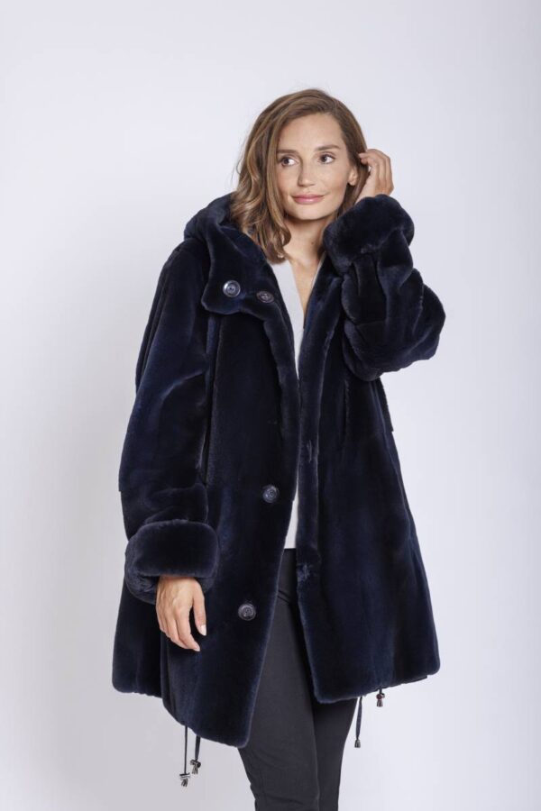 Sportlich mit einem Hauch von Eleganz. Der Wendeparka aus dunkelblauem Samtnerz und hochmodernem Steelstoff ist etwas besonderes. In den Stoff ist ein Stahlfaden verwebt der ihm eine ganz eigene Optik und einen besonderen Glanz verleiht. Selbstverständlich wasserabweisend ausgerüstet.