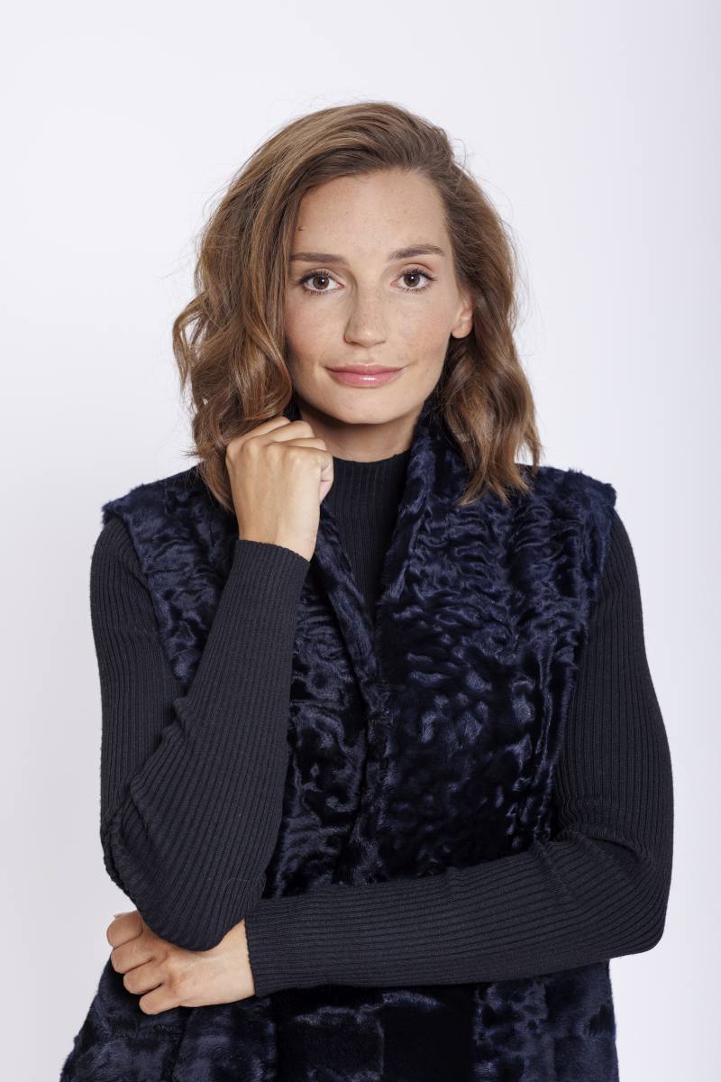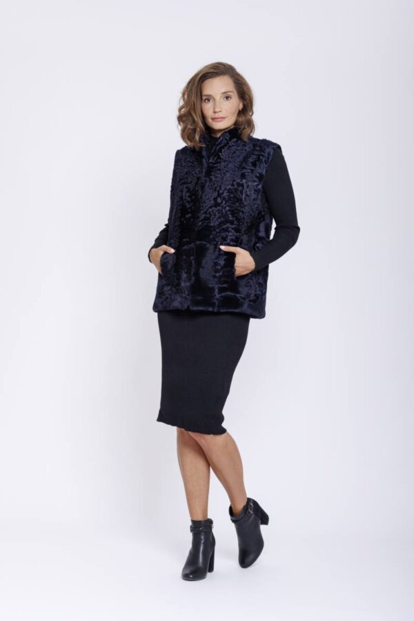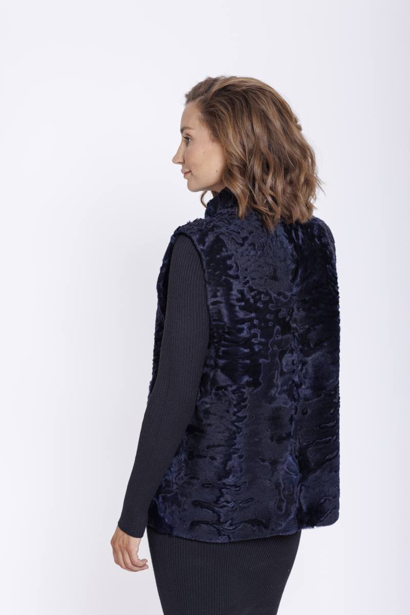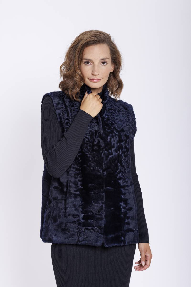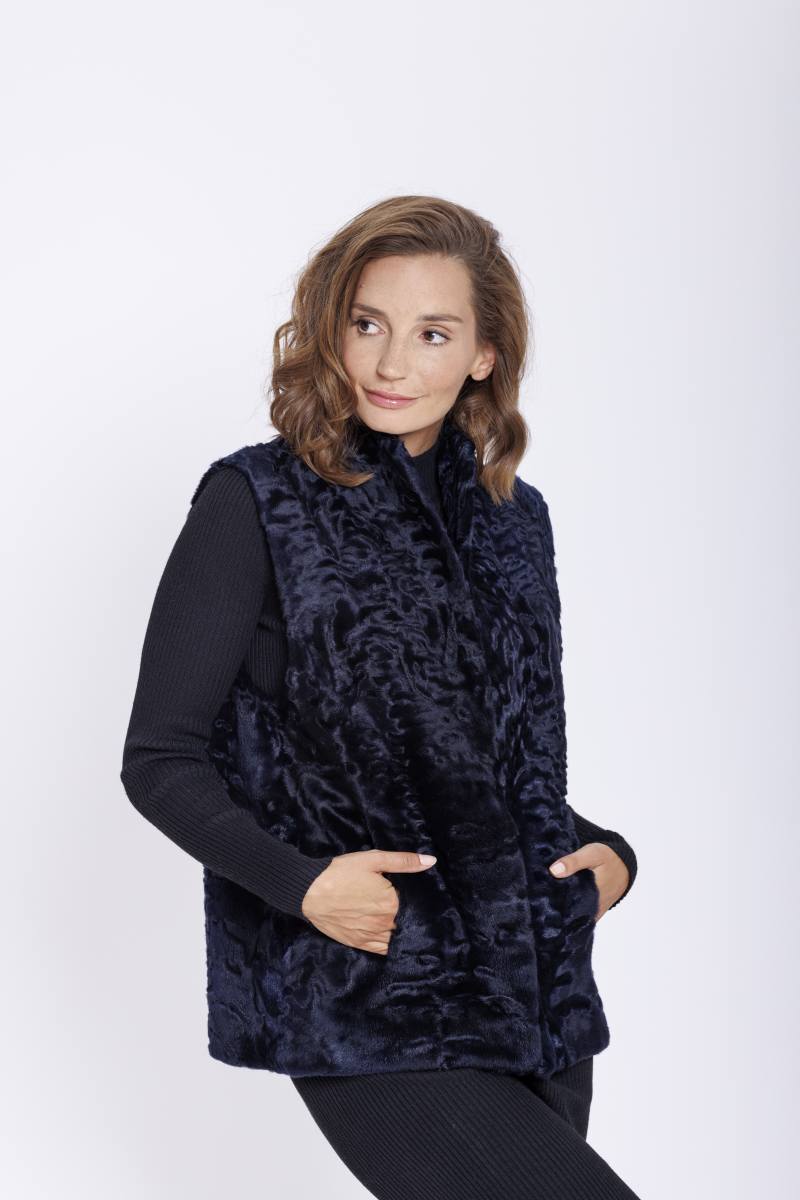 Fein gezeichnete Weste mit Kelchkragen aus Persianer. Farbe Nachtblau mit Schubtaschen.